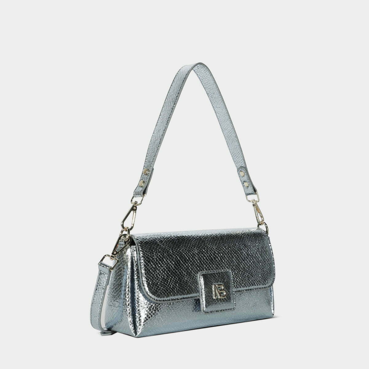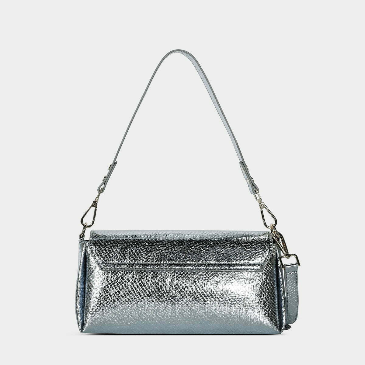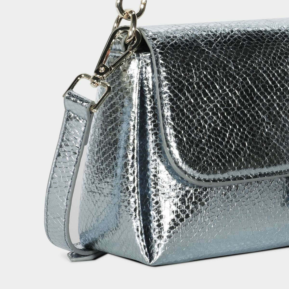 Lagos baguette bag available in two different materials; patent leather and metallic leatherette. It has different compartments inside so you can have a better organization. It also has an adjustable handle so you can carry it in two different ways: as a shoulder bag or as a shoulder bag. All the metallic details are in light gold.