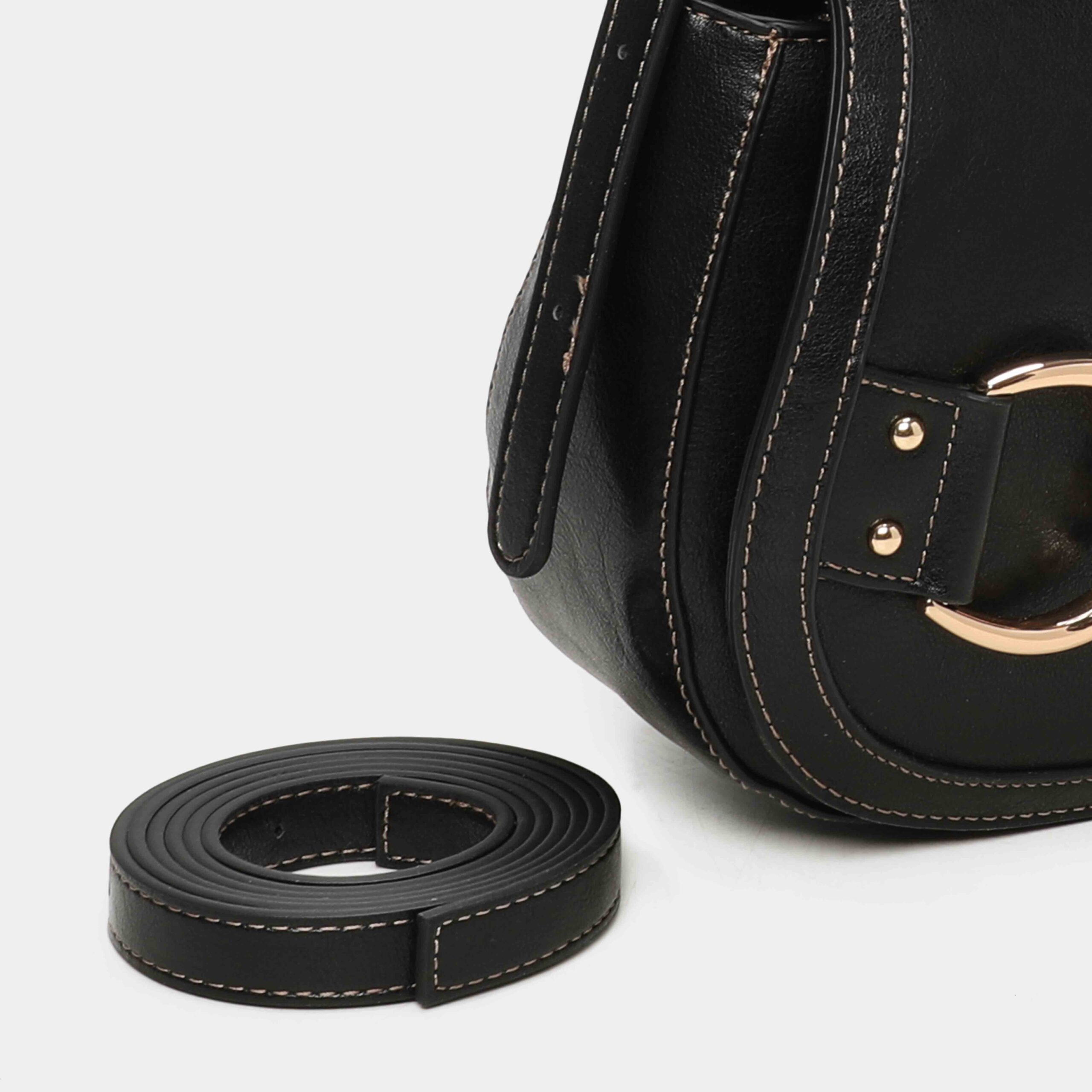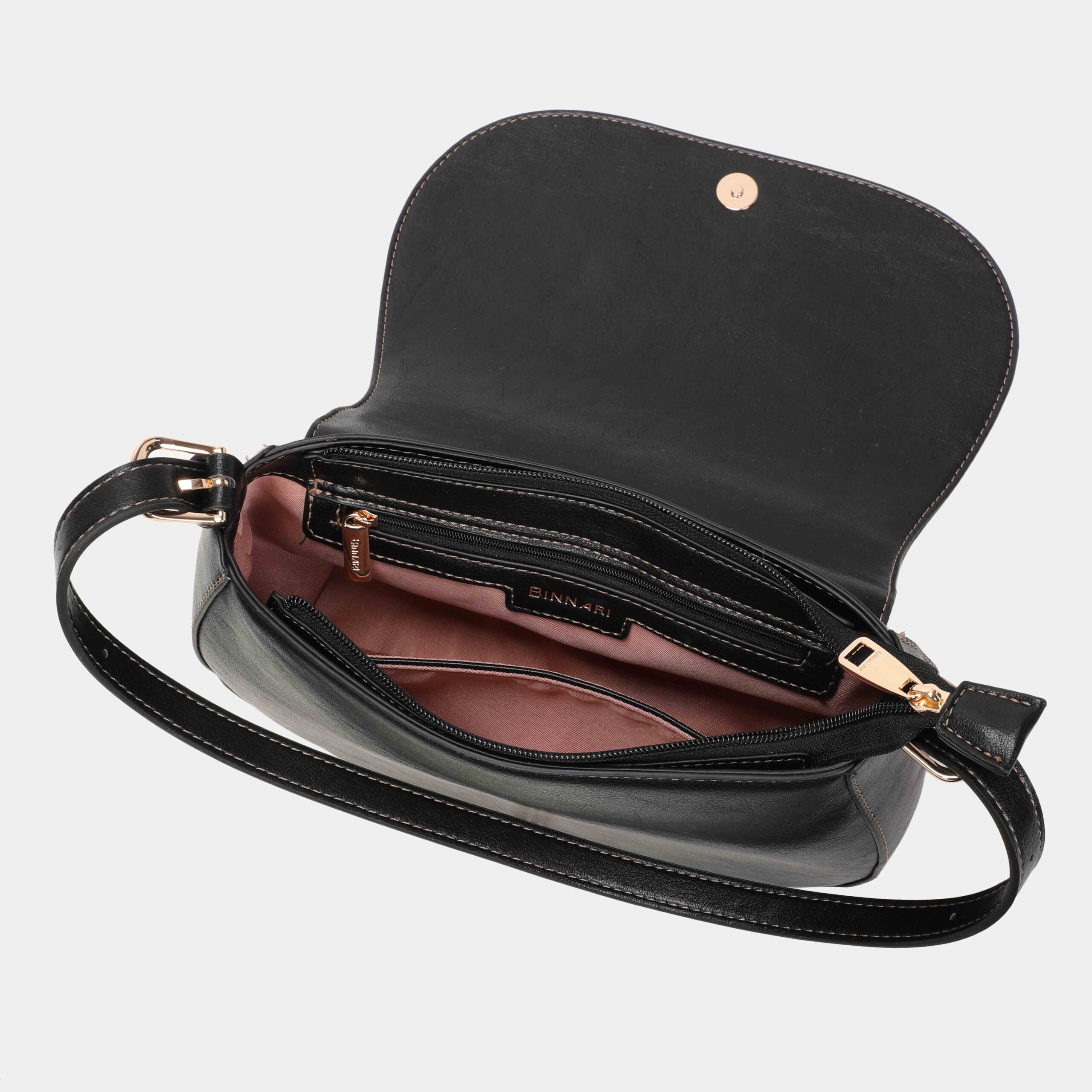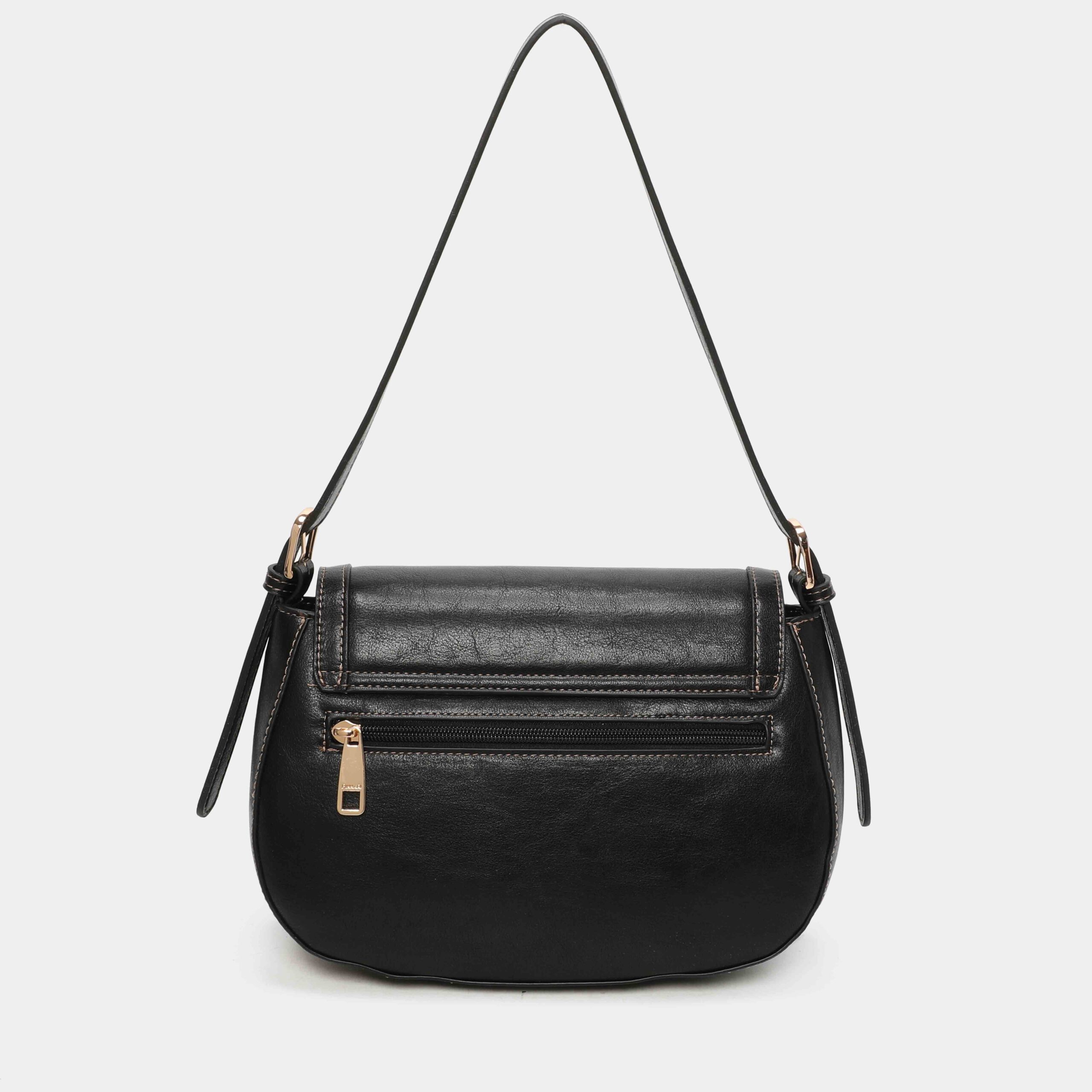 Fanny flap shoulder bag made in high quality pu. It is available in 3 colours.2 positions; shoulder or as a shoulder bag thanks to the adjustable handle inside. The interior is accessed through a flap. Inside there is a zipped pocket. Decorative details in light gold colour.