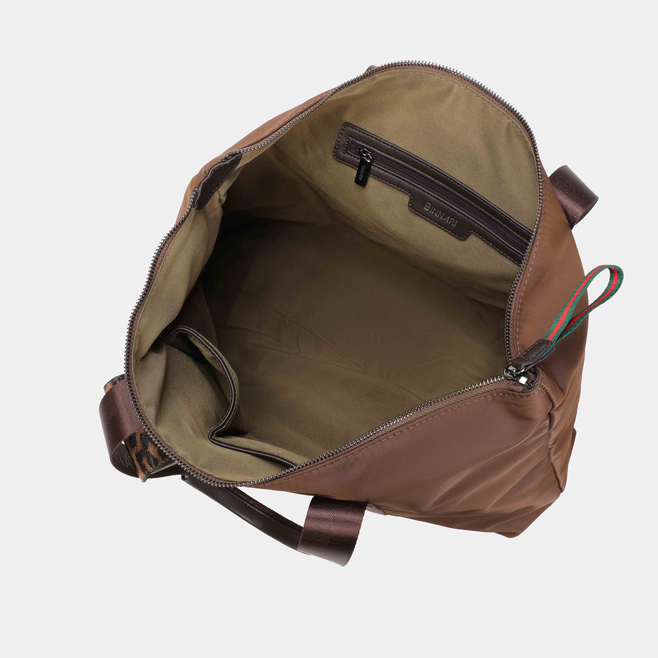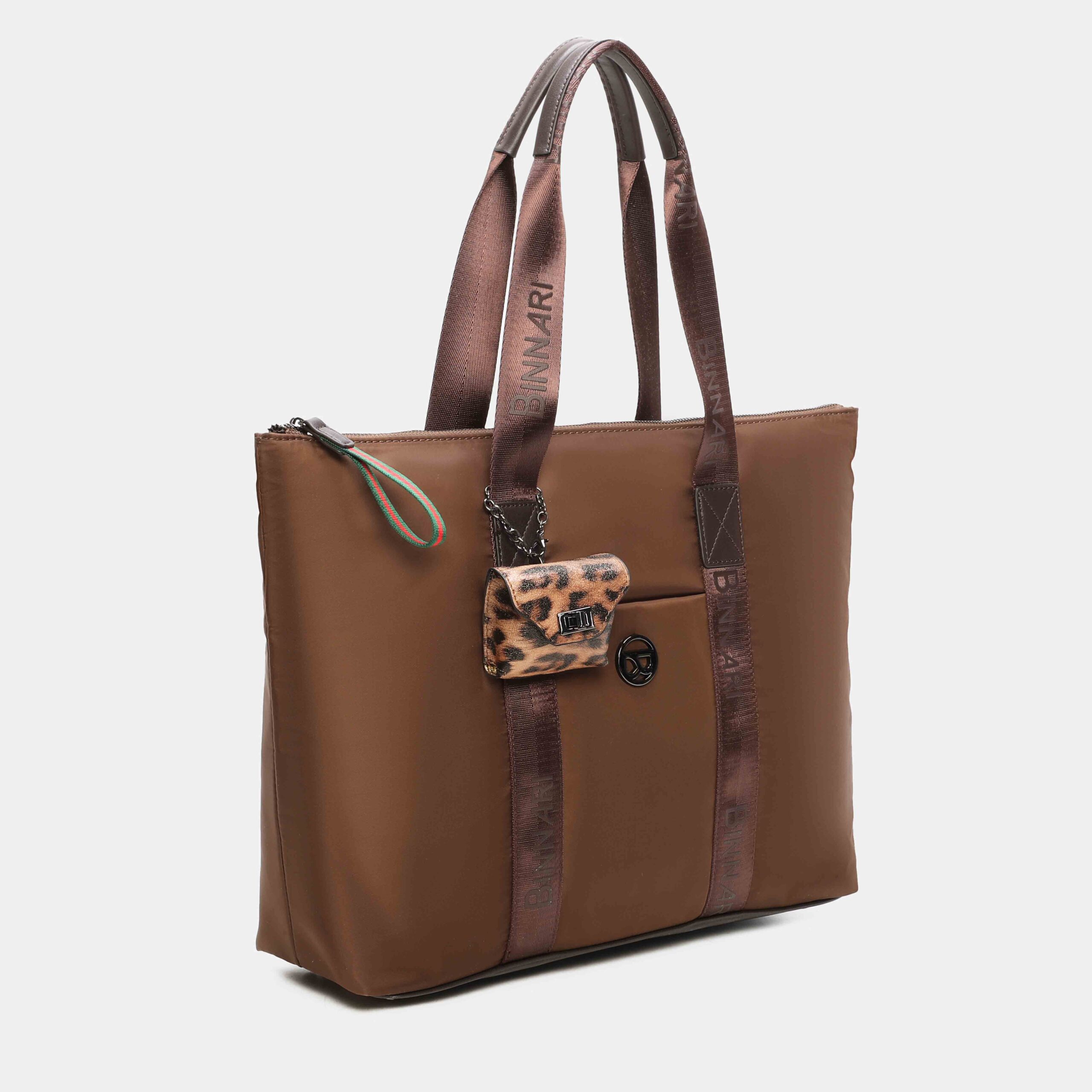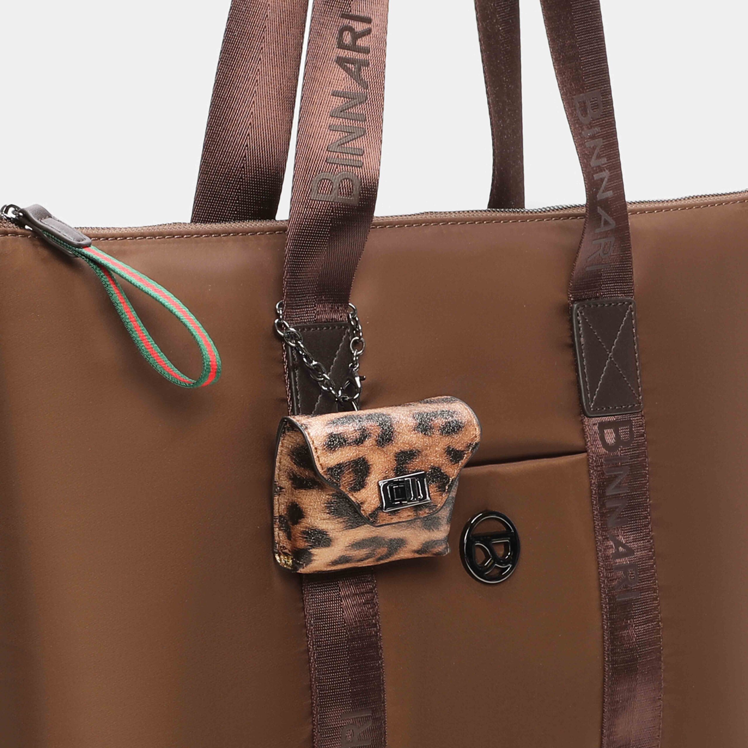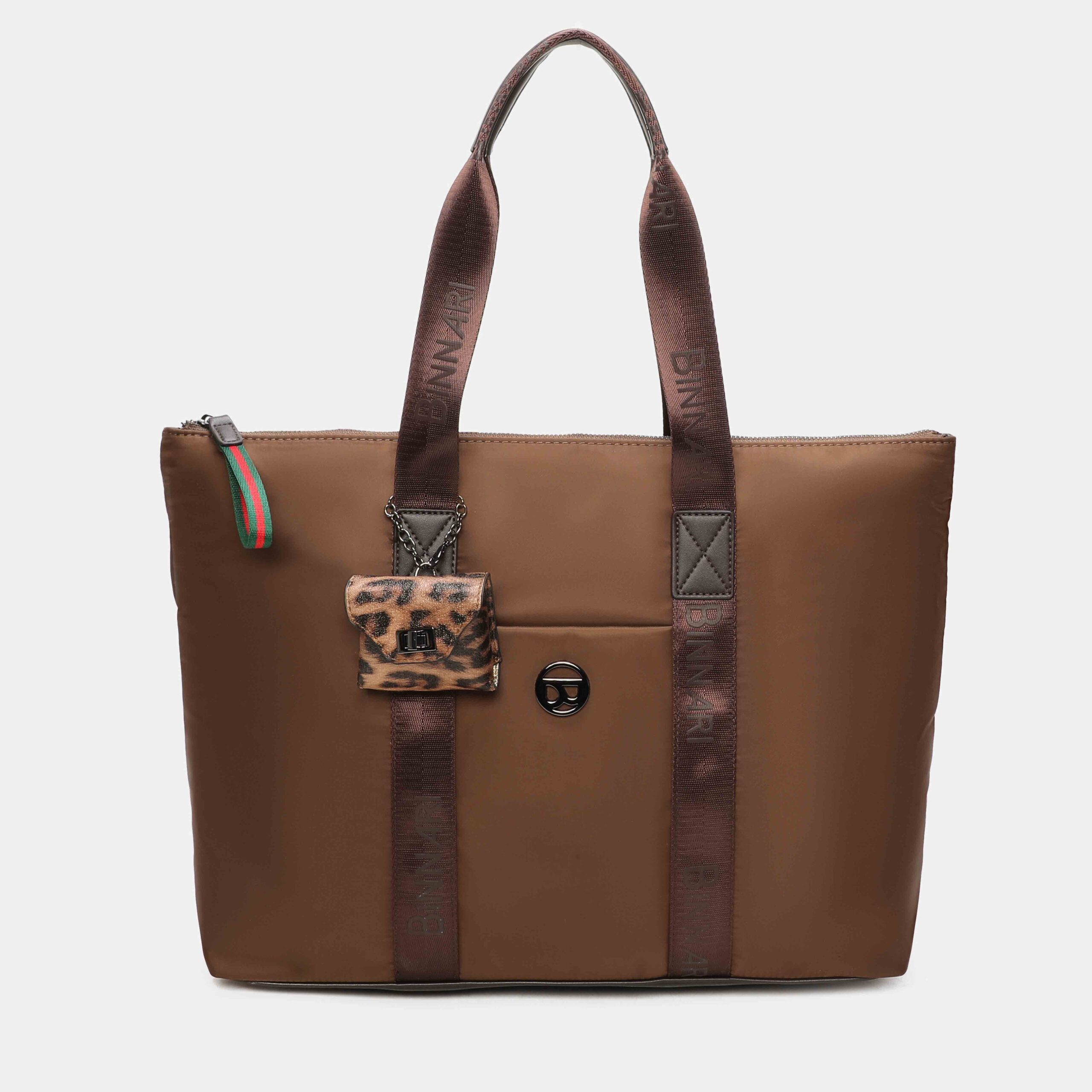 Fini shopper bag available in 3 colours: black, leather and khaki. Made in recycled nylon and pu details, it has a small removable decorative bag in the front part of the bag, as well as a pocket. Access to the interior is via a top zip. Large bag that will be useful for everyday use. Metallic details in black nickel colour.