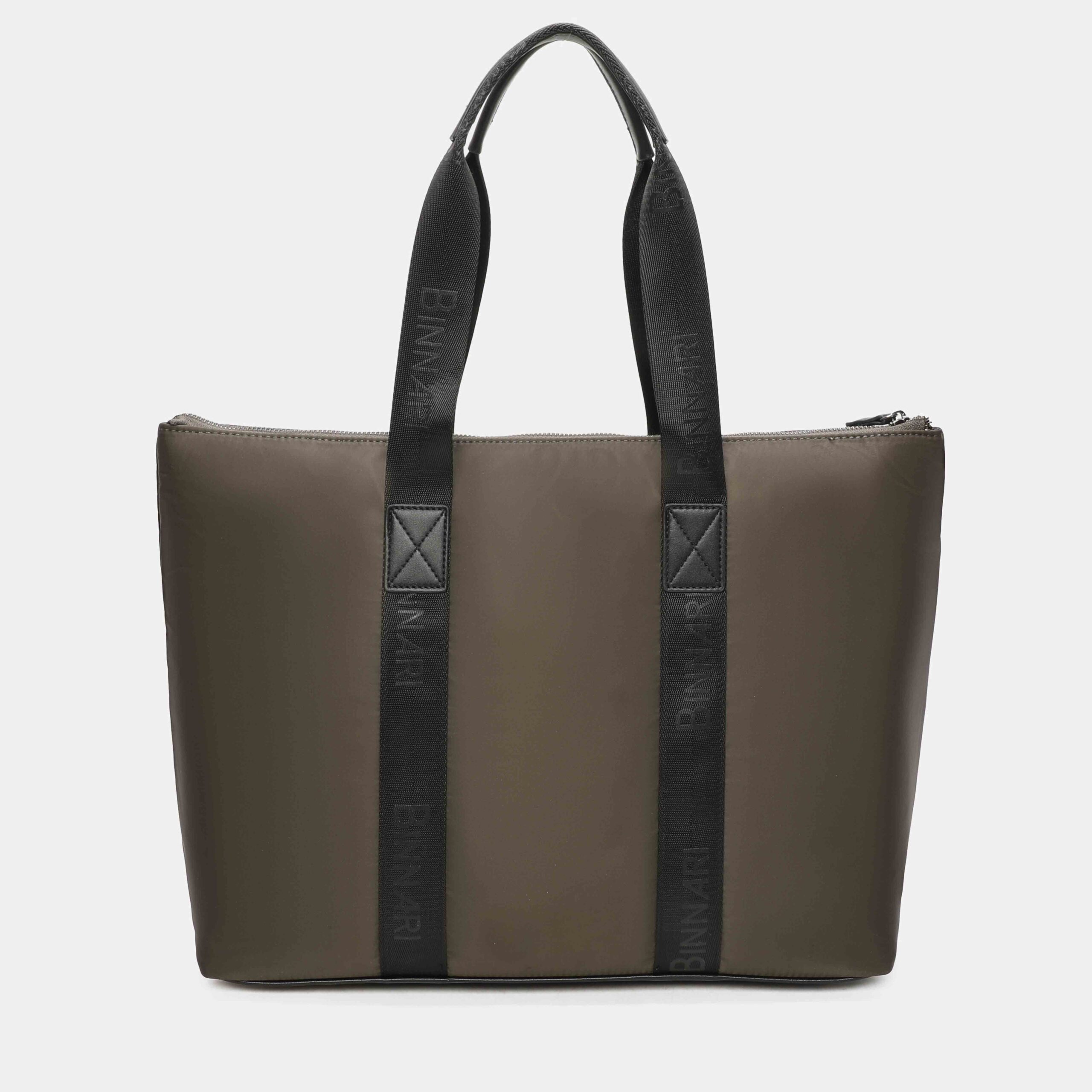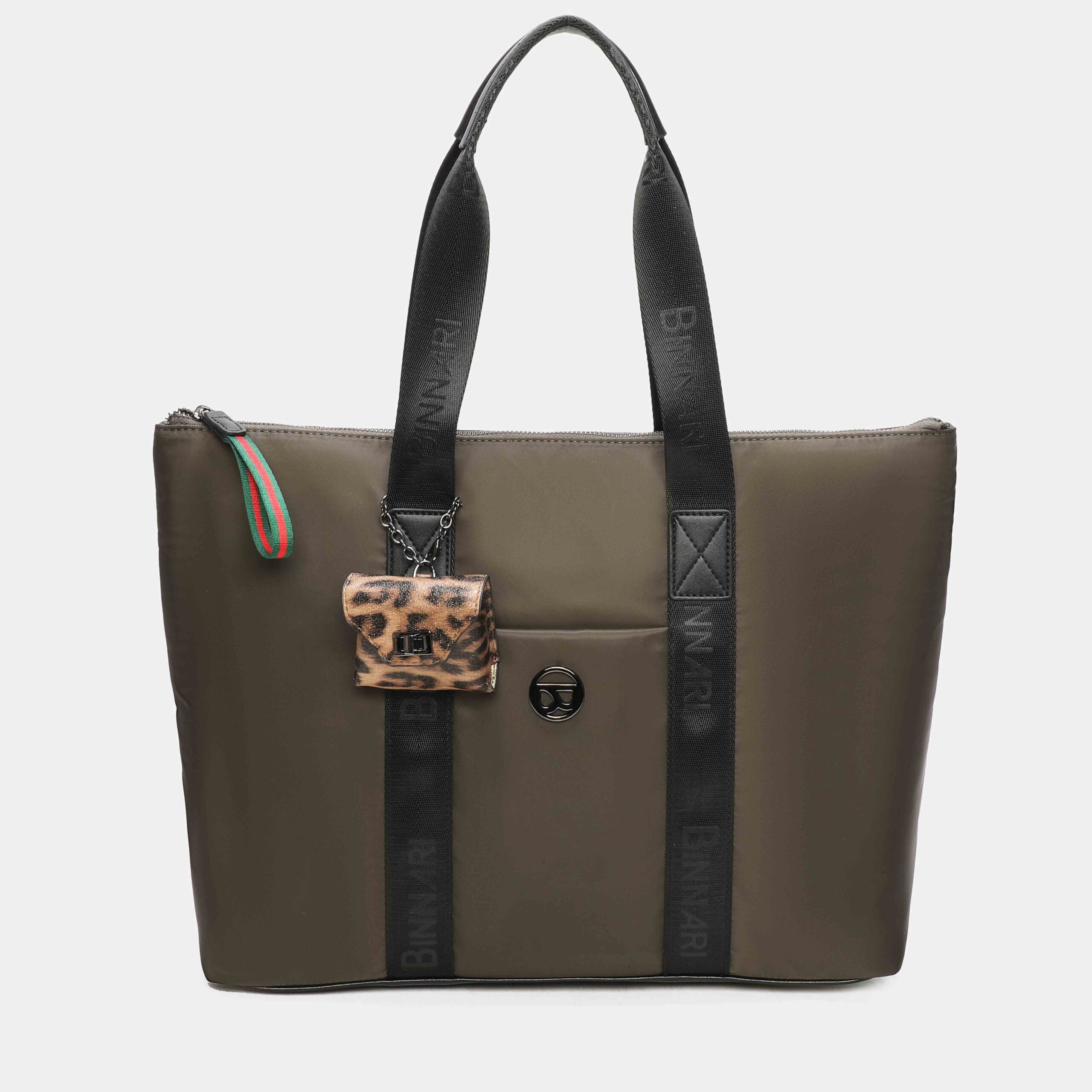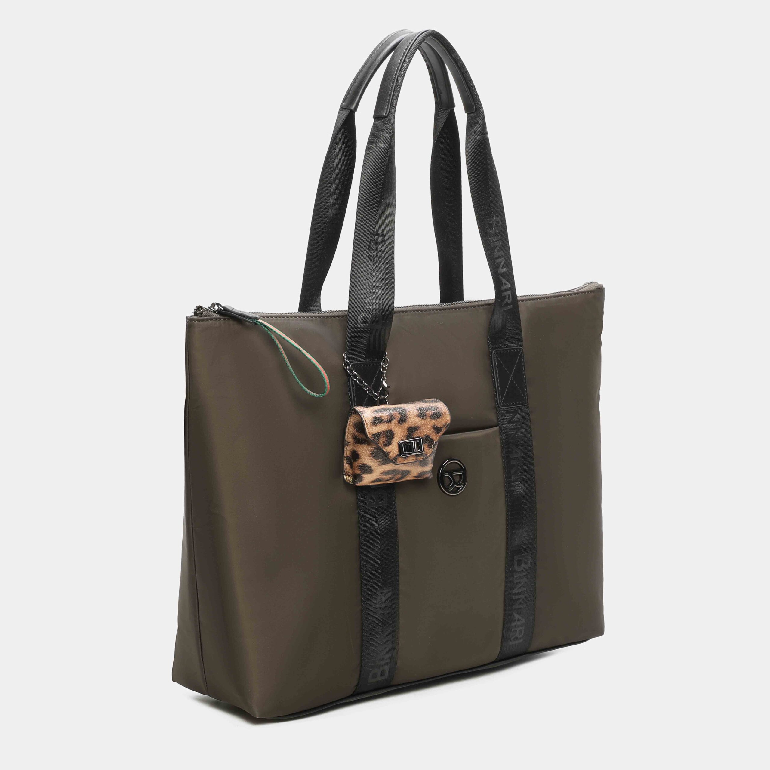 Fini shopper bag available in 3 colours: black, leather and khaki. Made in recycled nylon and pu details, it has a small removable decorative bag in the front part of the bag, as well as a pocket. Access to the interior is via a top zip. Large bag that will be useful for everyday use. Metallic details in black nickel colour.