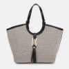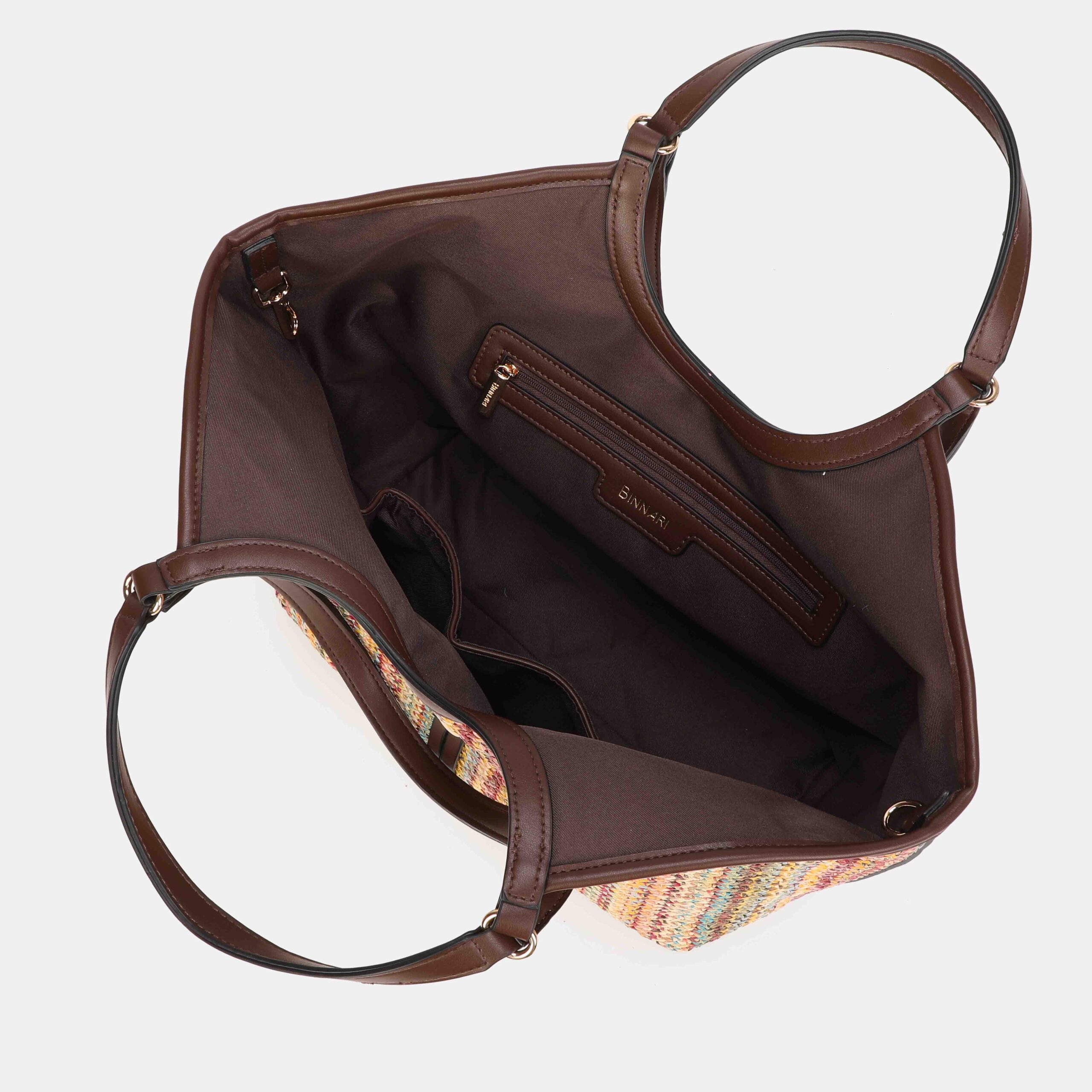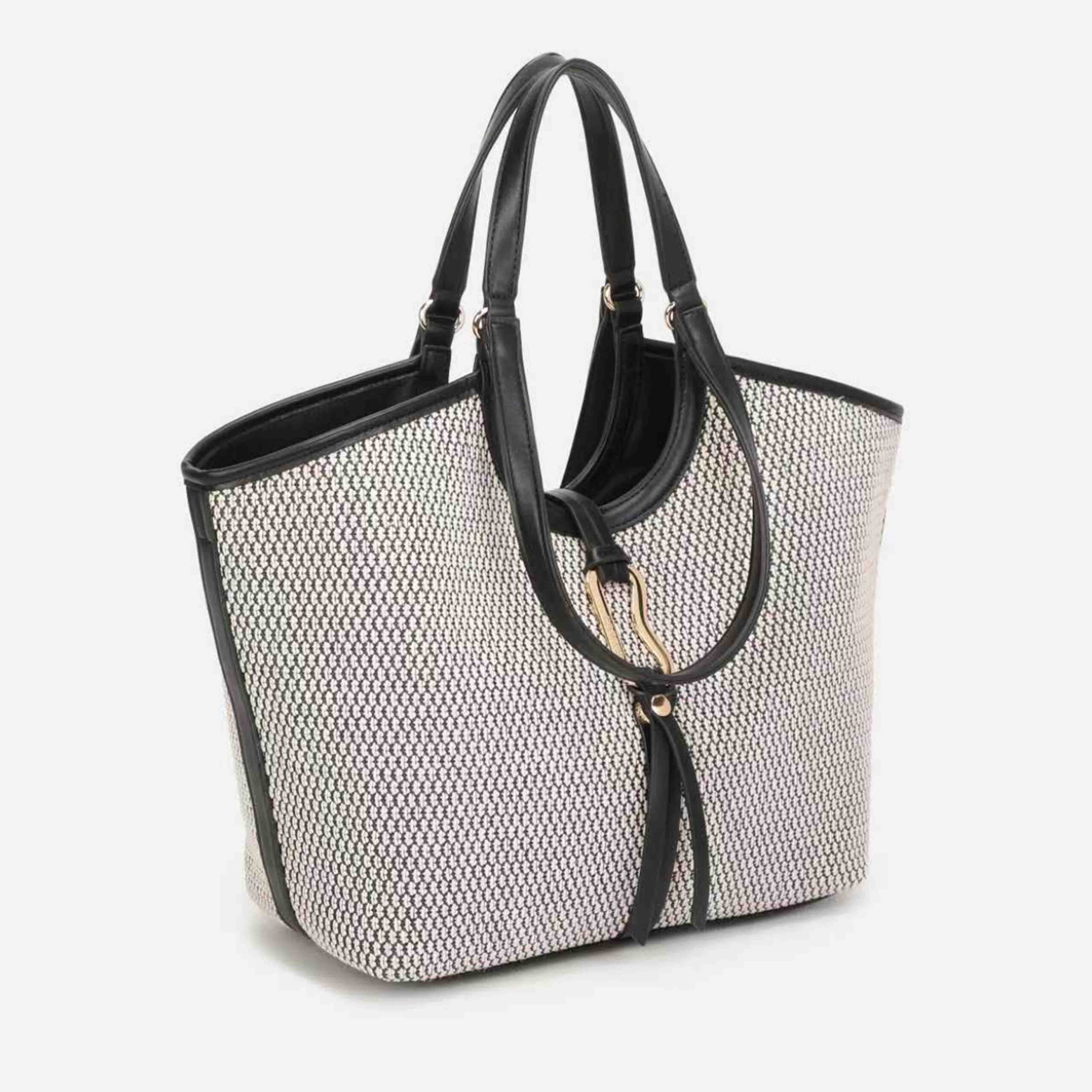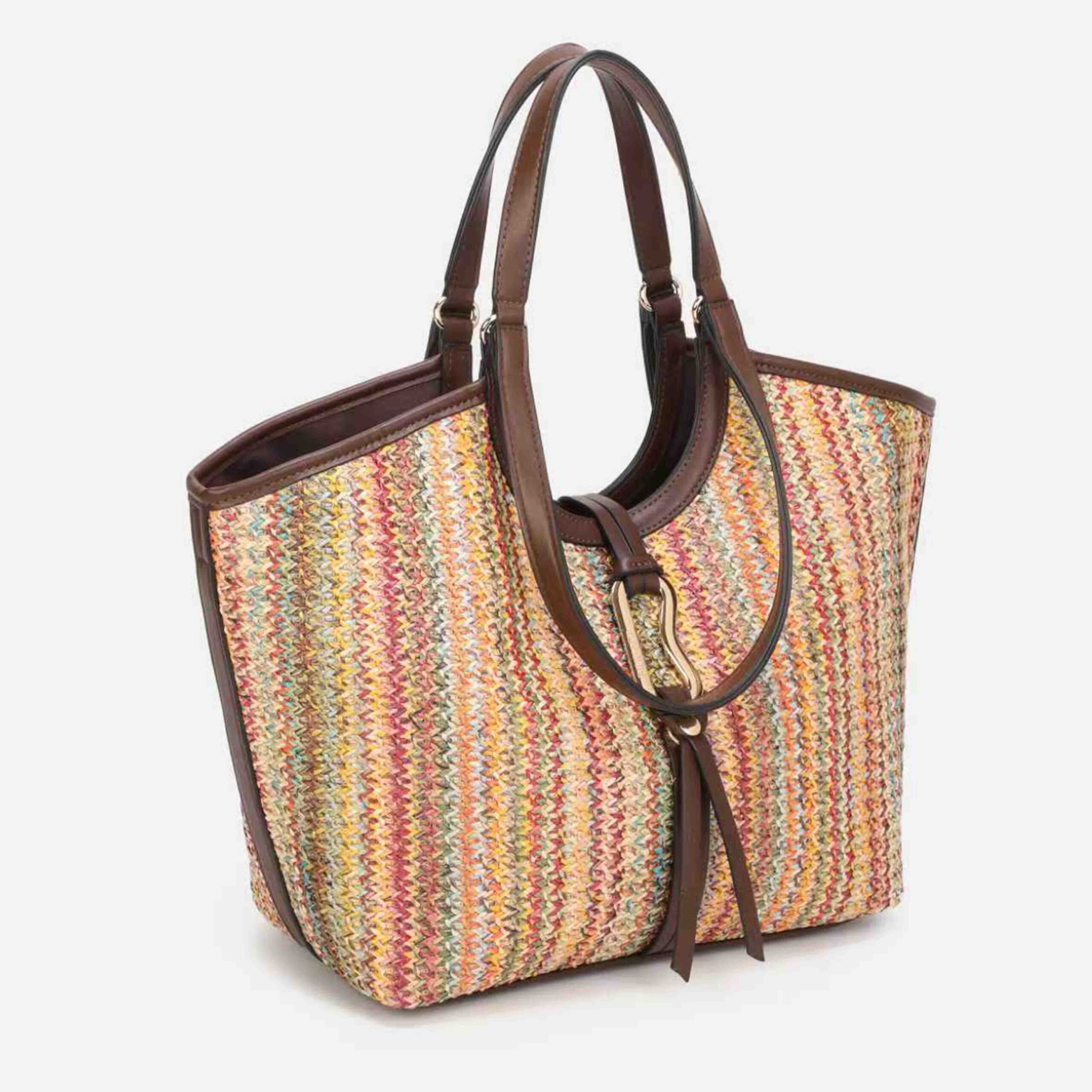 One of this season’s trending bags, the small Lina handbag. It is made of raffia and pu details. It has 2 positions: hand and shoulder strap. Exterior has closure with B. The metallic details are light gold. Don’t miss yours!