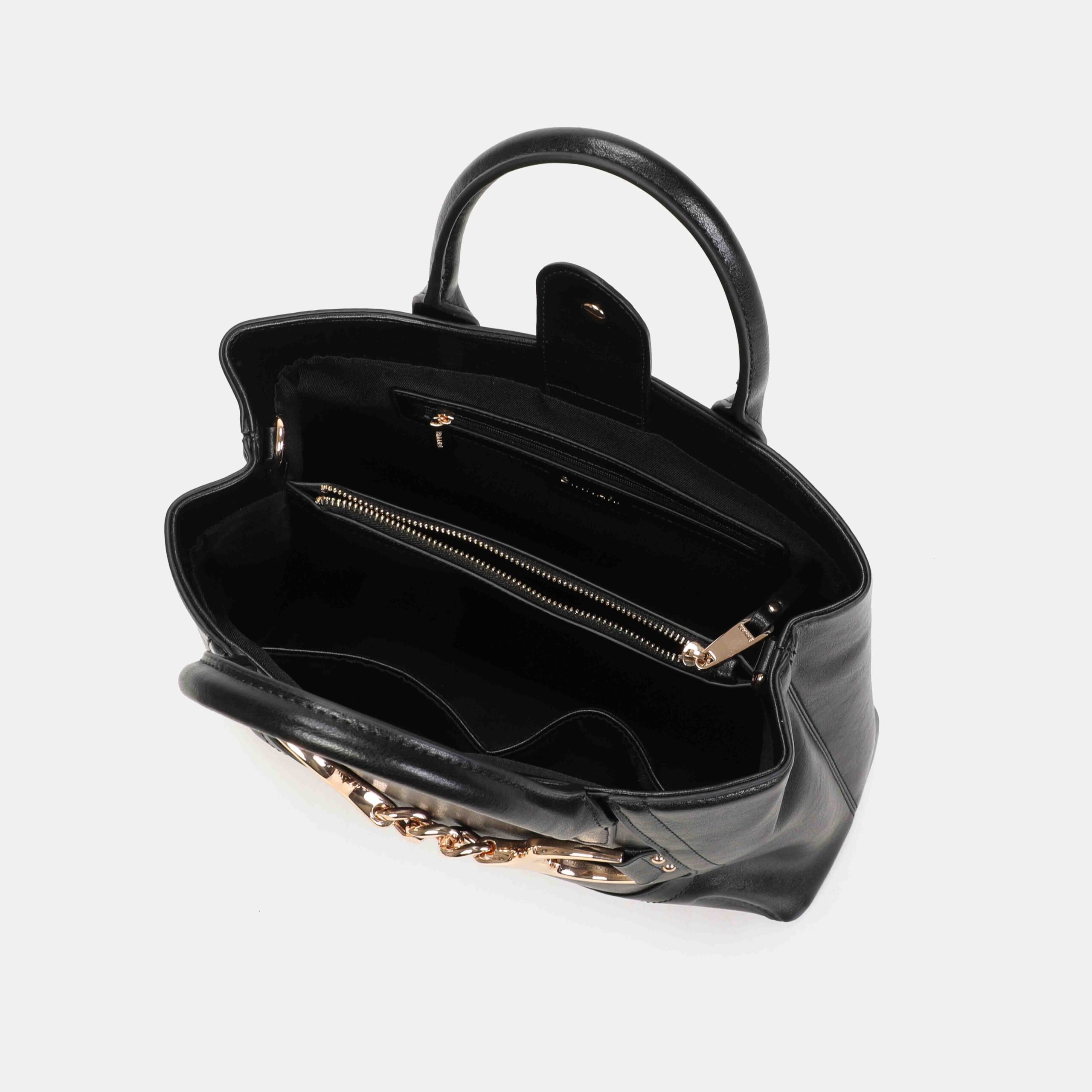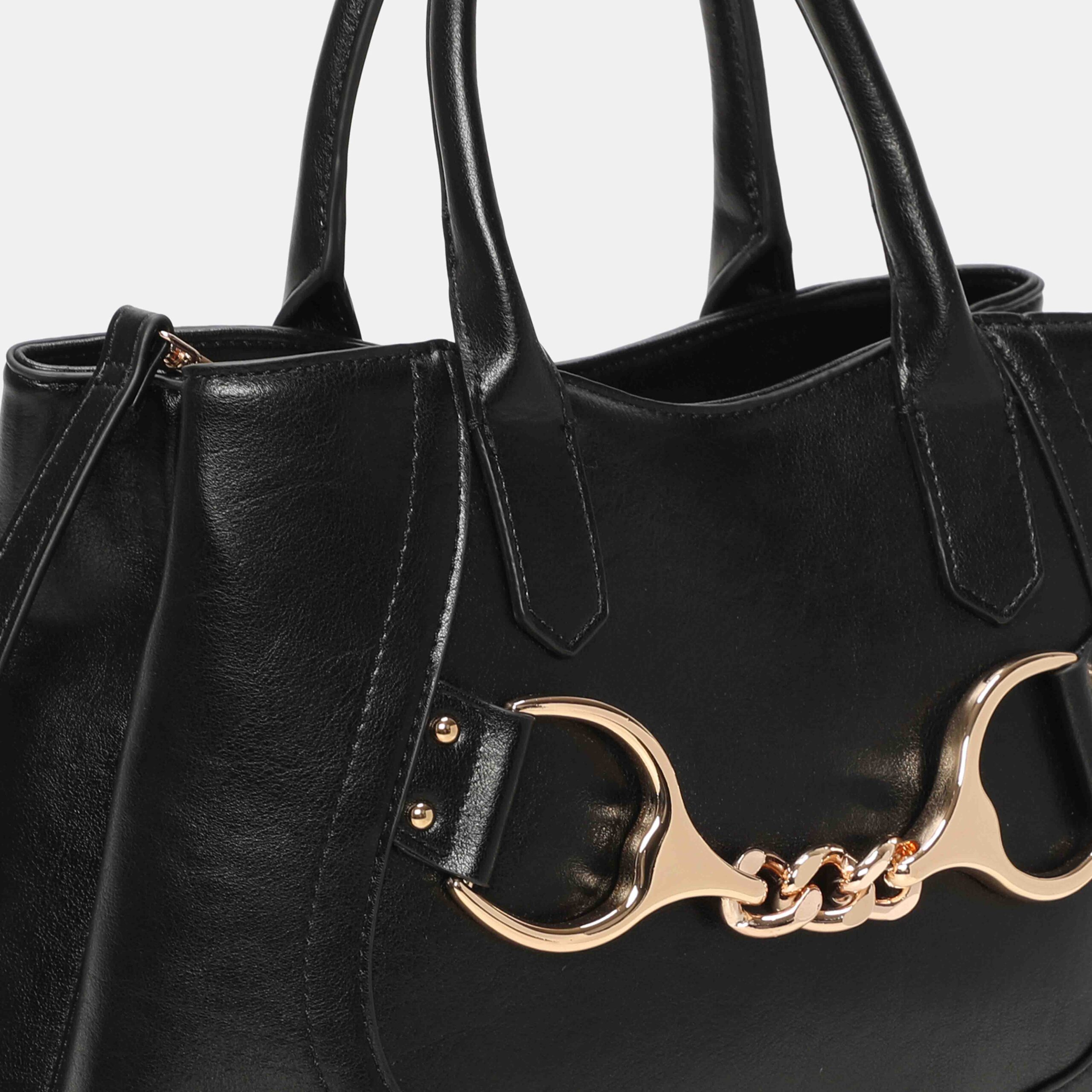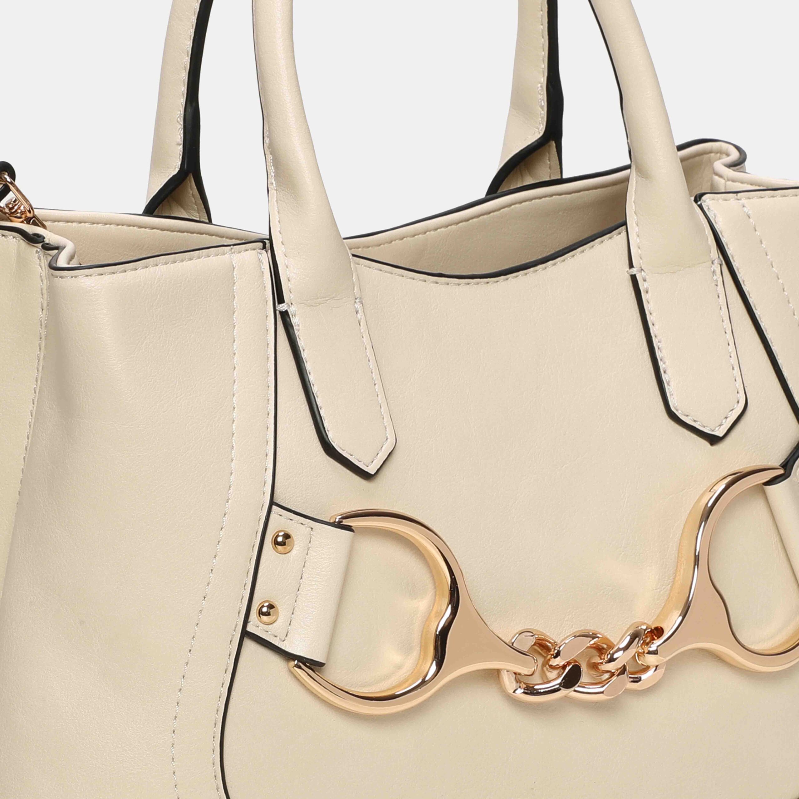 Medium-large size bag made of high quality PU, with a structured and elegant design. It has short handles to carry it in the hand and an adjustable strap to wear it on the shoulder. Its gold-tone metallic detail on the front adds a sophisticated touch. A versatile, spacious bag that is perfect to accompany you in your day to day with stylus.