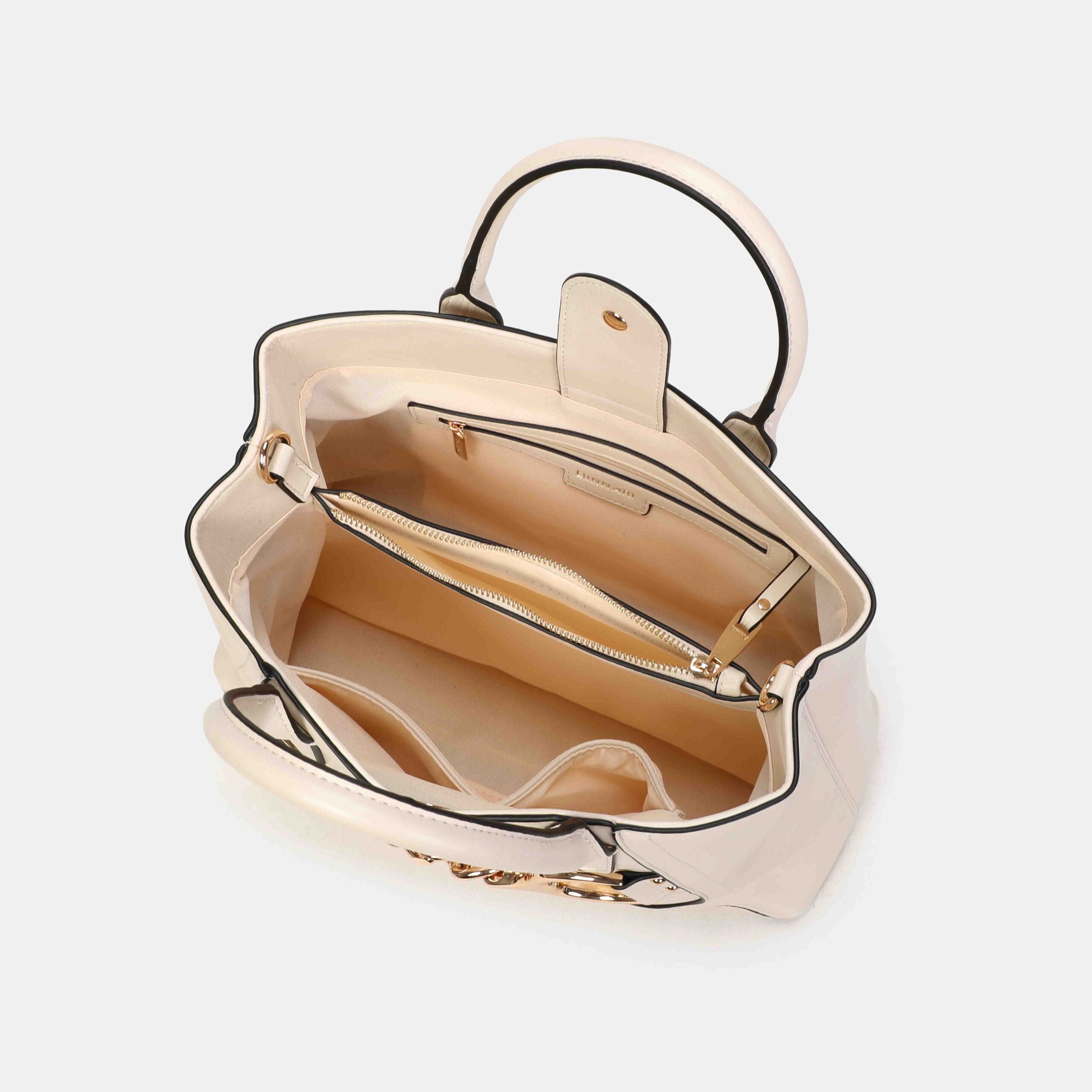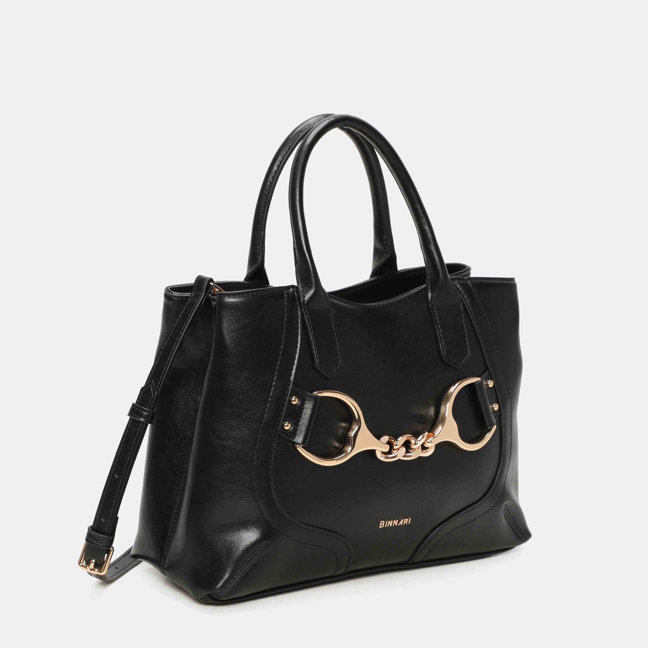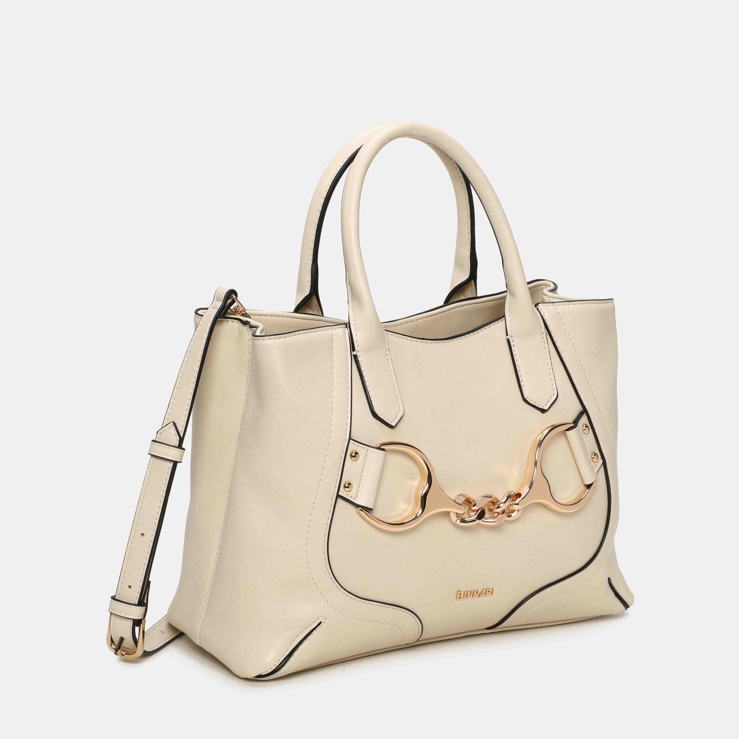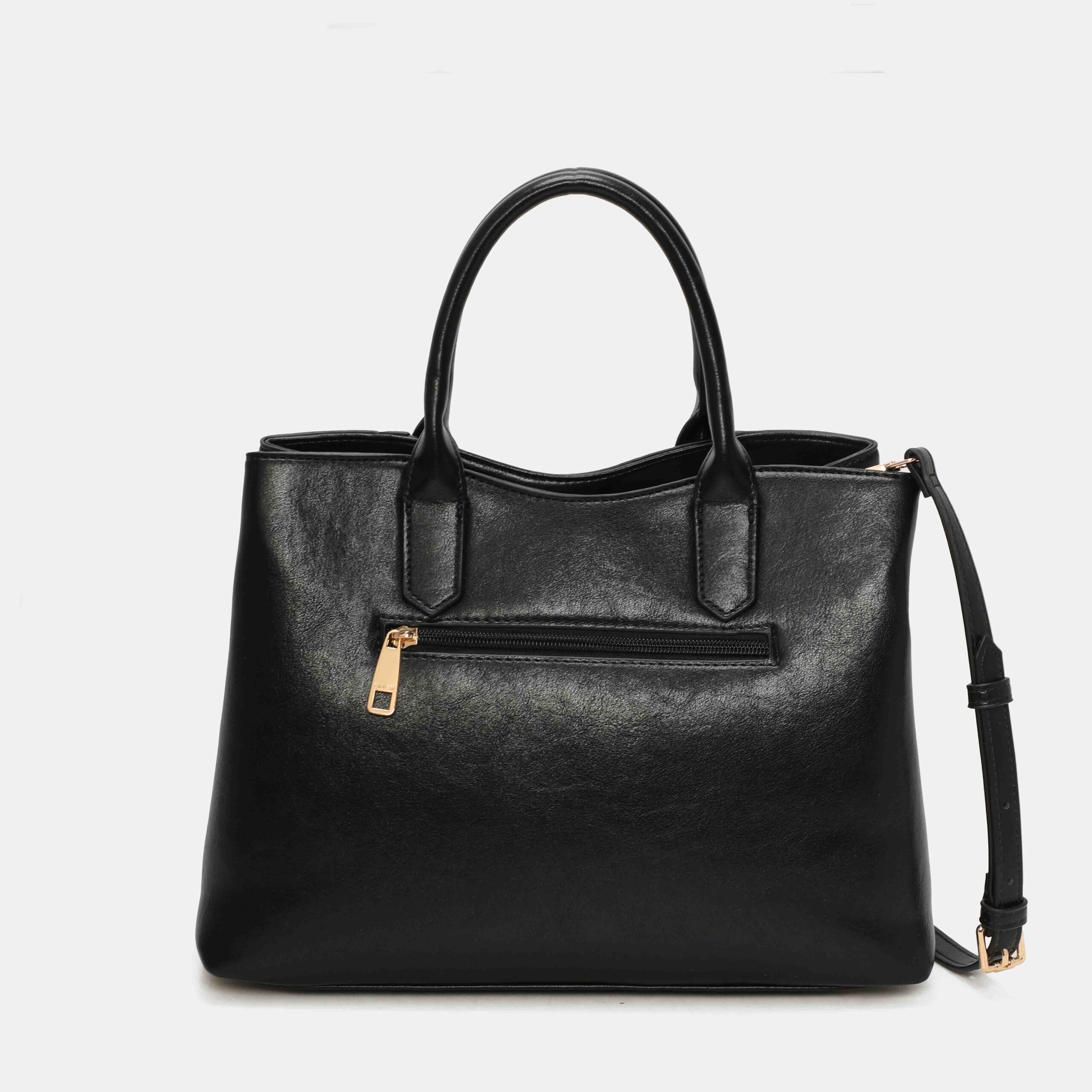 Medium-large size bag made of high quality PU, with a structured and elegant design. It has short handles to carry it in the hand and an adjustable strap to wear it on the shoulder. Its gold-tone metallic detail on the front adds a sophisticated touch. A versatile, spacious bag that is perfect to accompany you in your day to day with stylus.