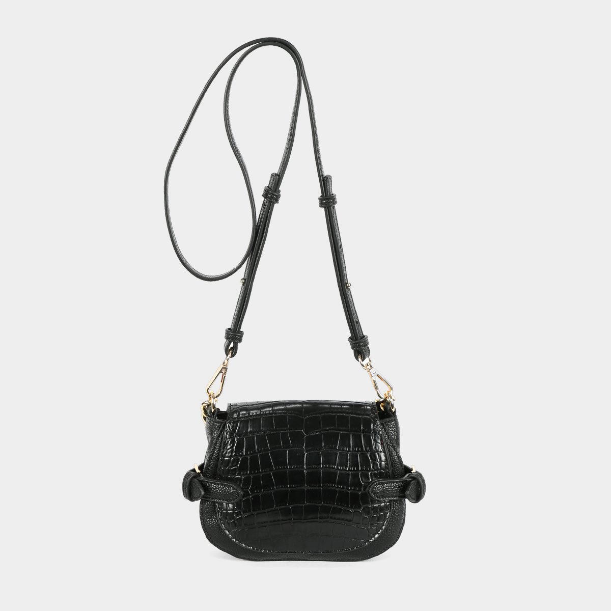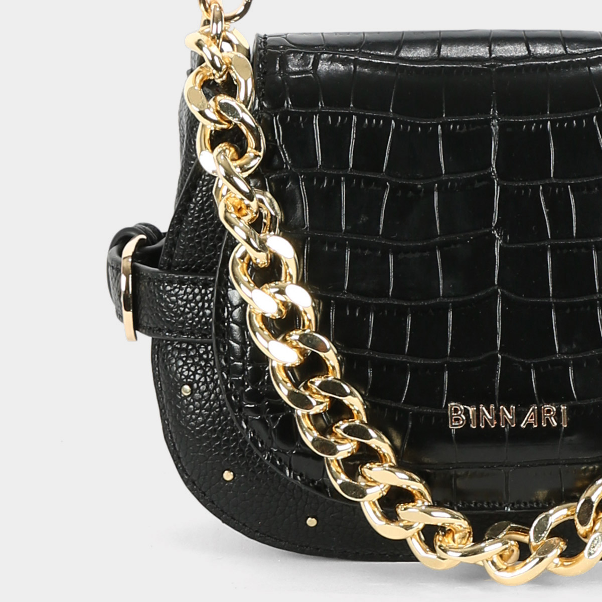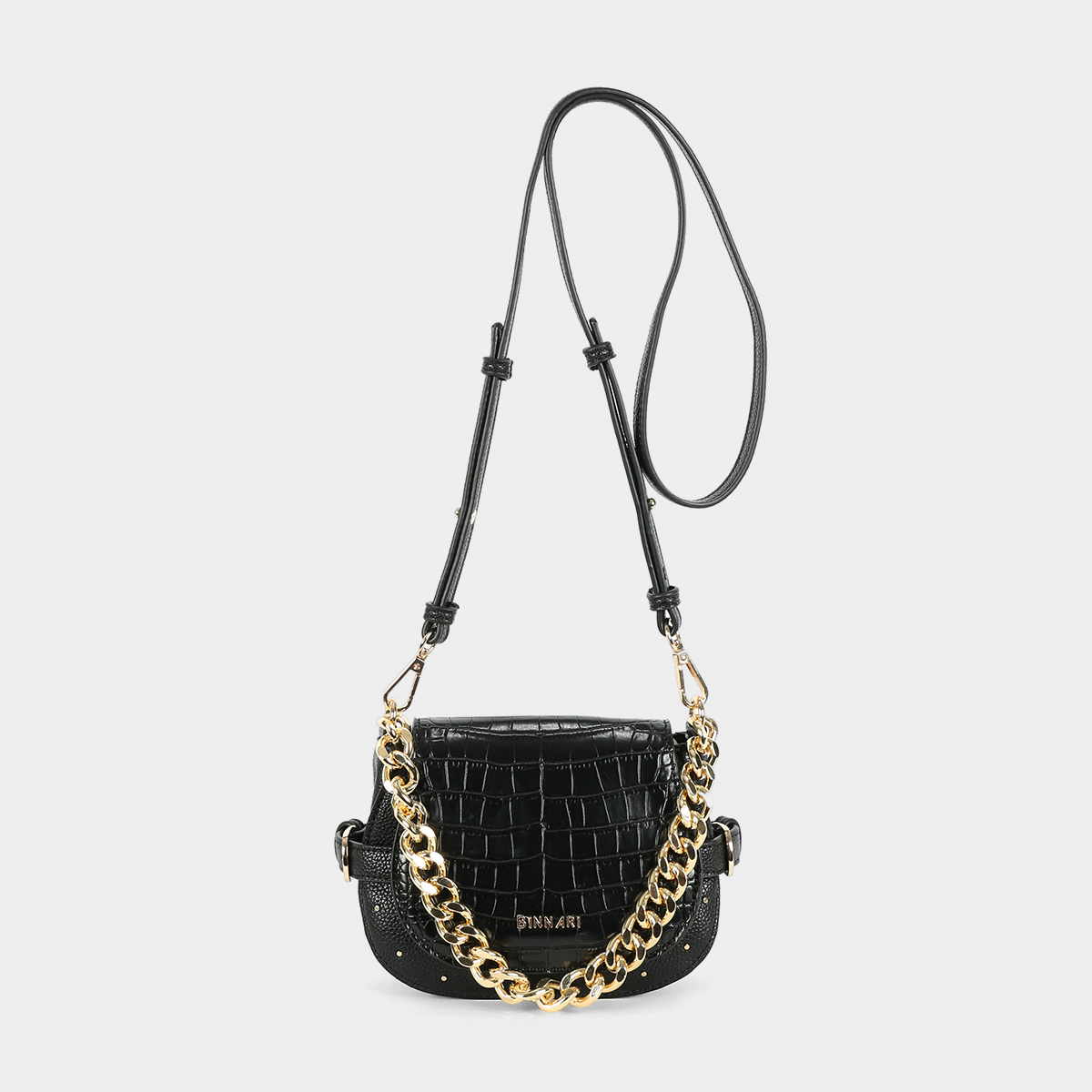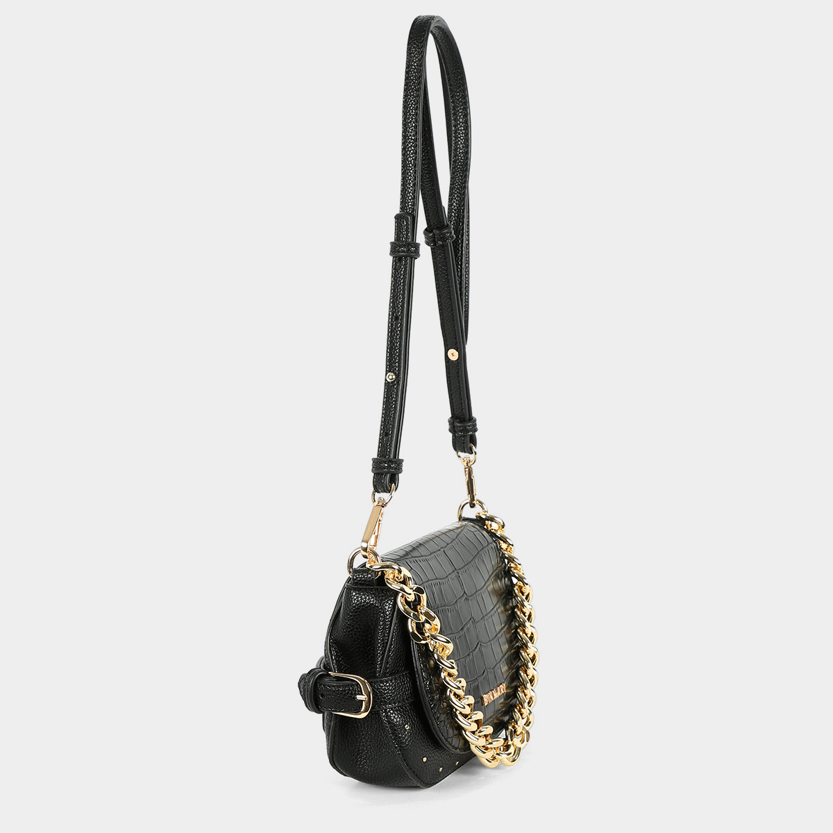 Rea small shoulder bag available in camel, black and taupe. It is a small shoulder bag. Design made of smooth patent leather and printed patent leather. It has a decorative golden chain that hangs from the ends of the handles. On the front there are small decorative circular golden studs.
