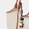 With a summery and very modern style, this bag combines textile material with braided PU edges, creating a handmade finish full of charm. It includes a removable decorative detail with colored beads that adds personality to the design. Its long handles allow it to be comfortably carried on the shoulder. A wide, light and perfect model to complete your seasonal looks.