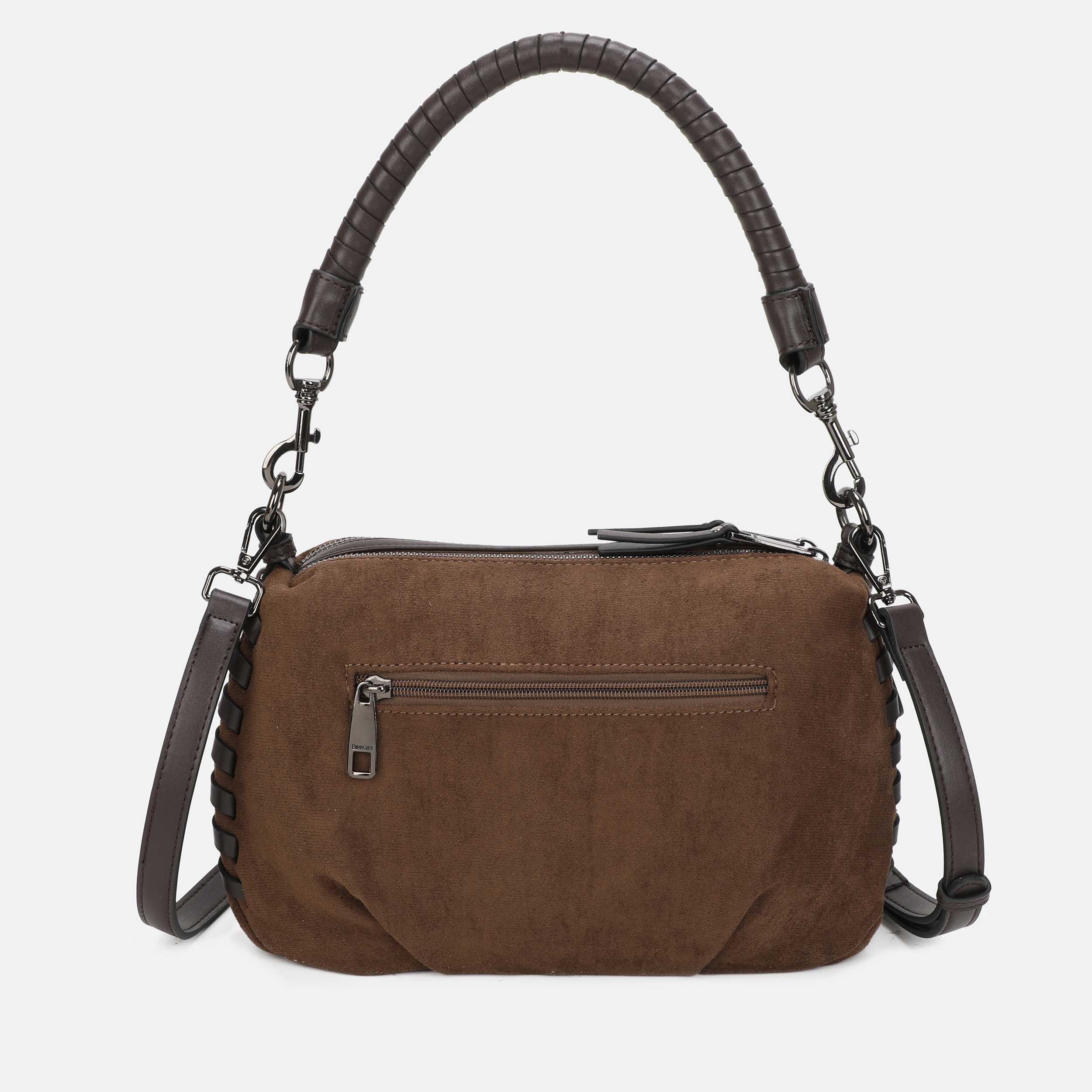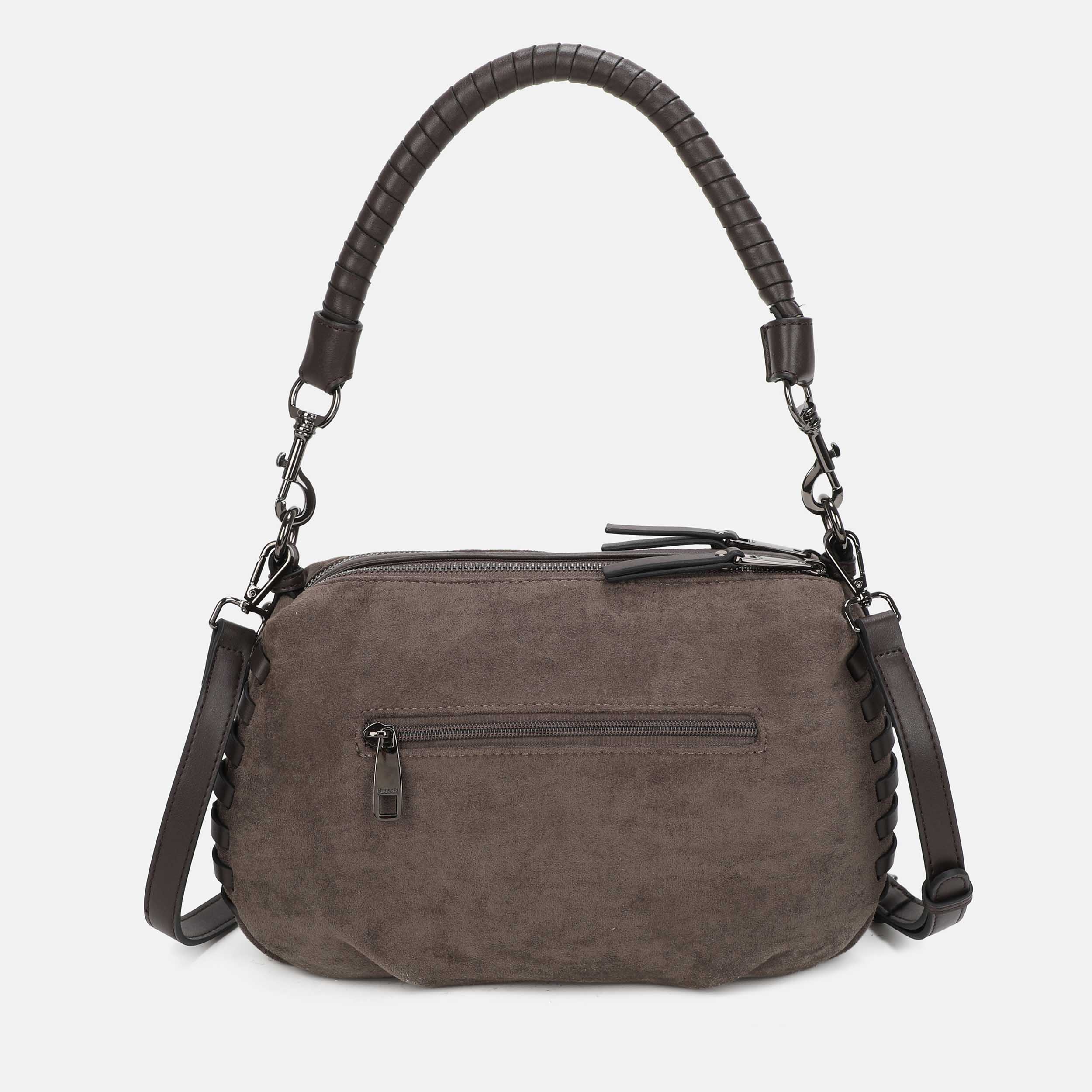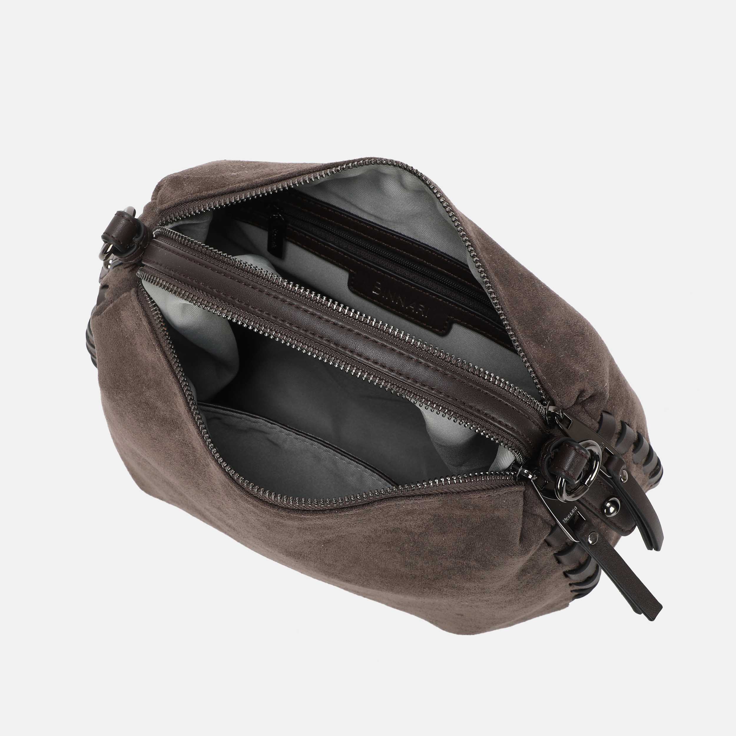 Bolso bandolera Flavia disponible en 4 colores. Está confeccioando en antelina y detalles en pu de alta calidad. Sus dos asas trenzadas principales son regulables aportando así mucha más comodidad. Tiene 2 compartimentos pricipales, ambos con cremallera. Los detalles son de color nickel.