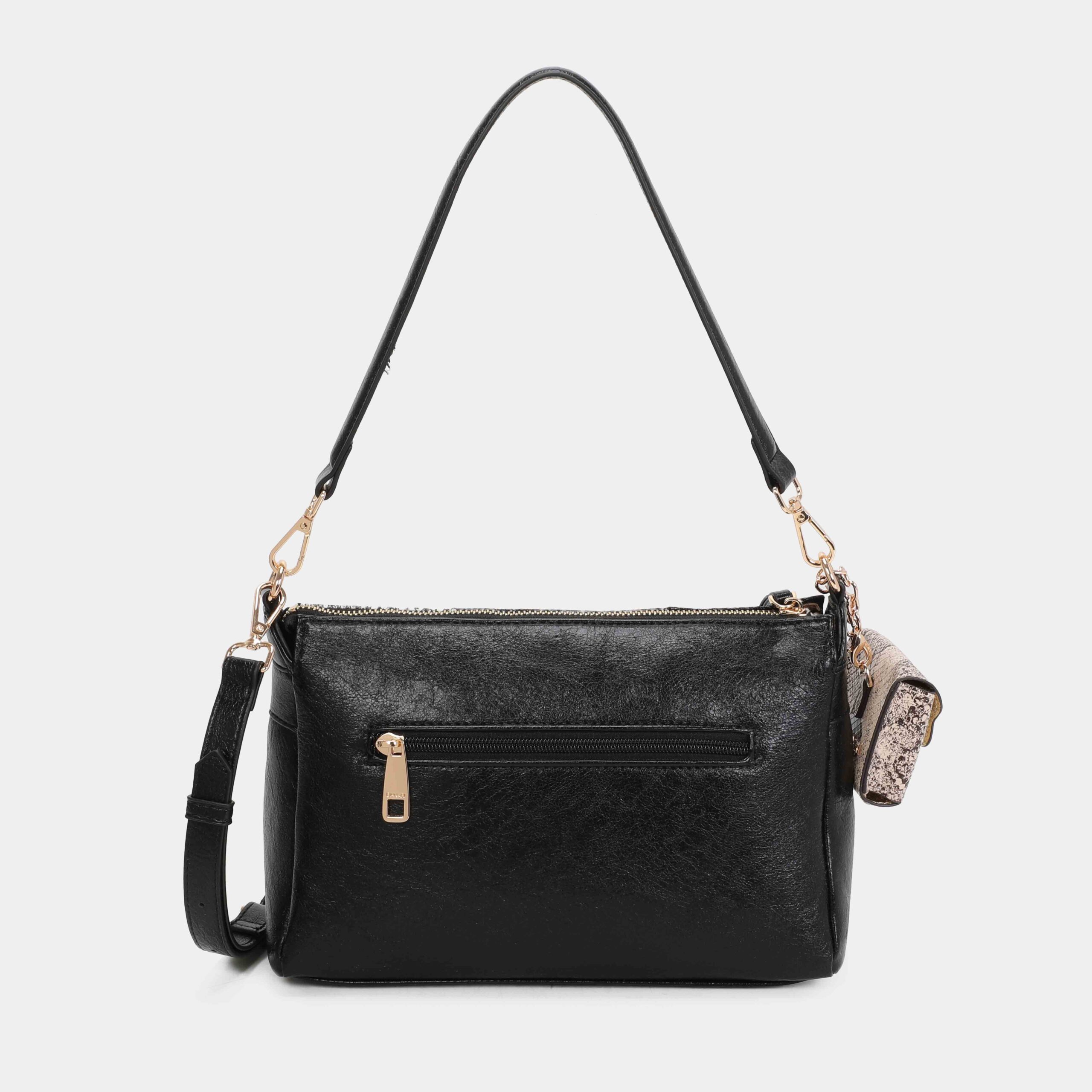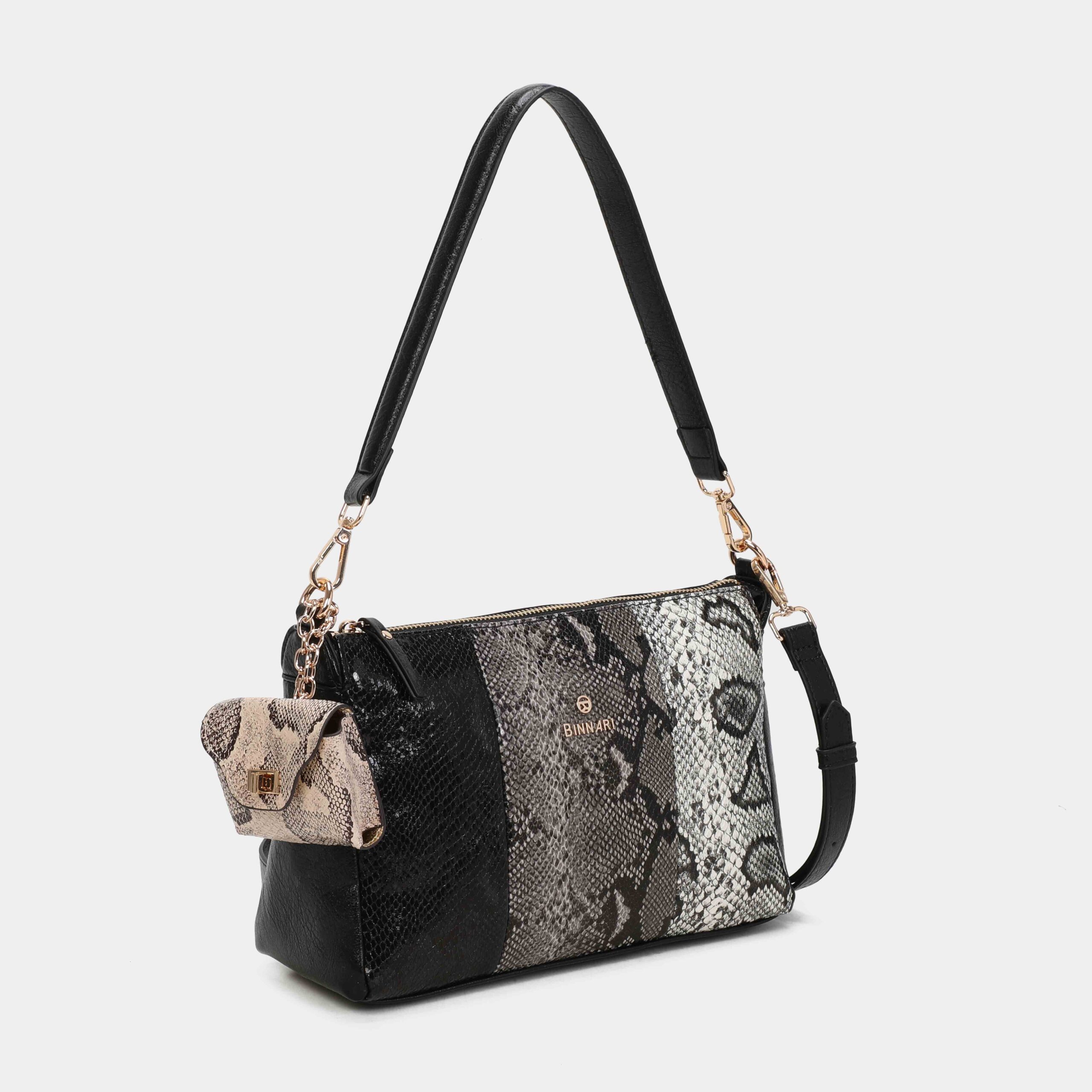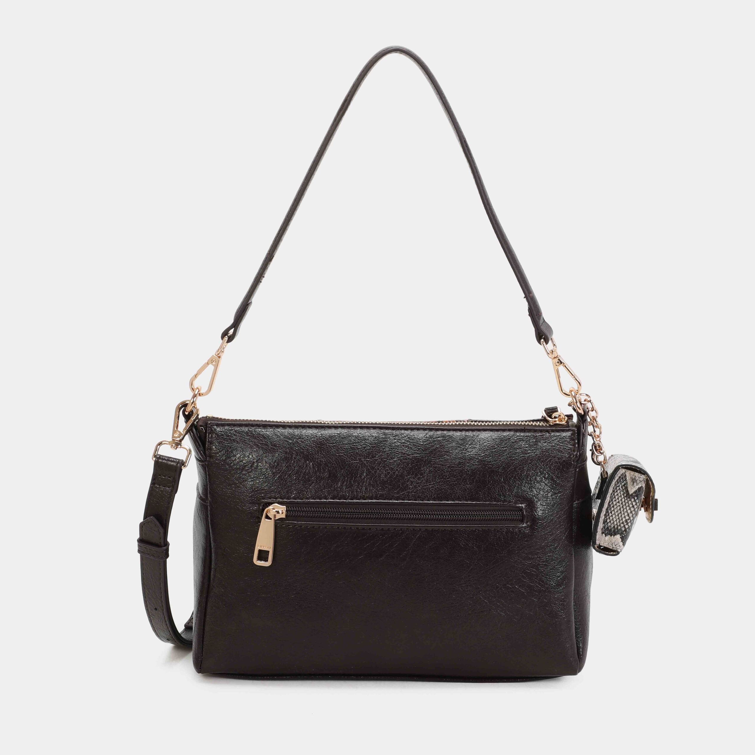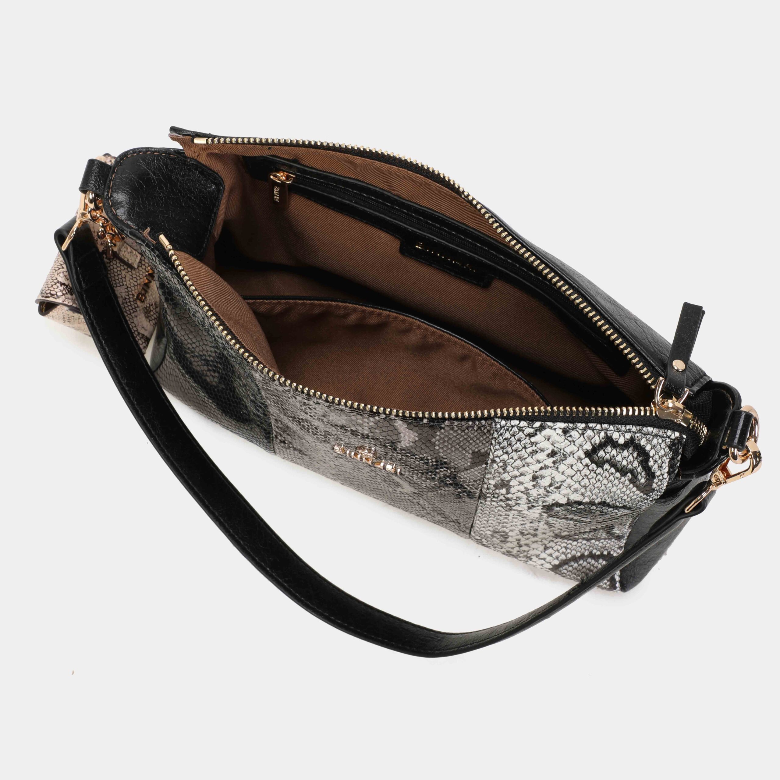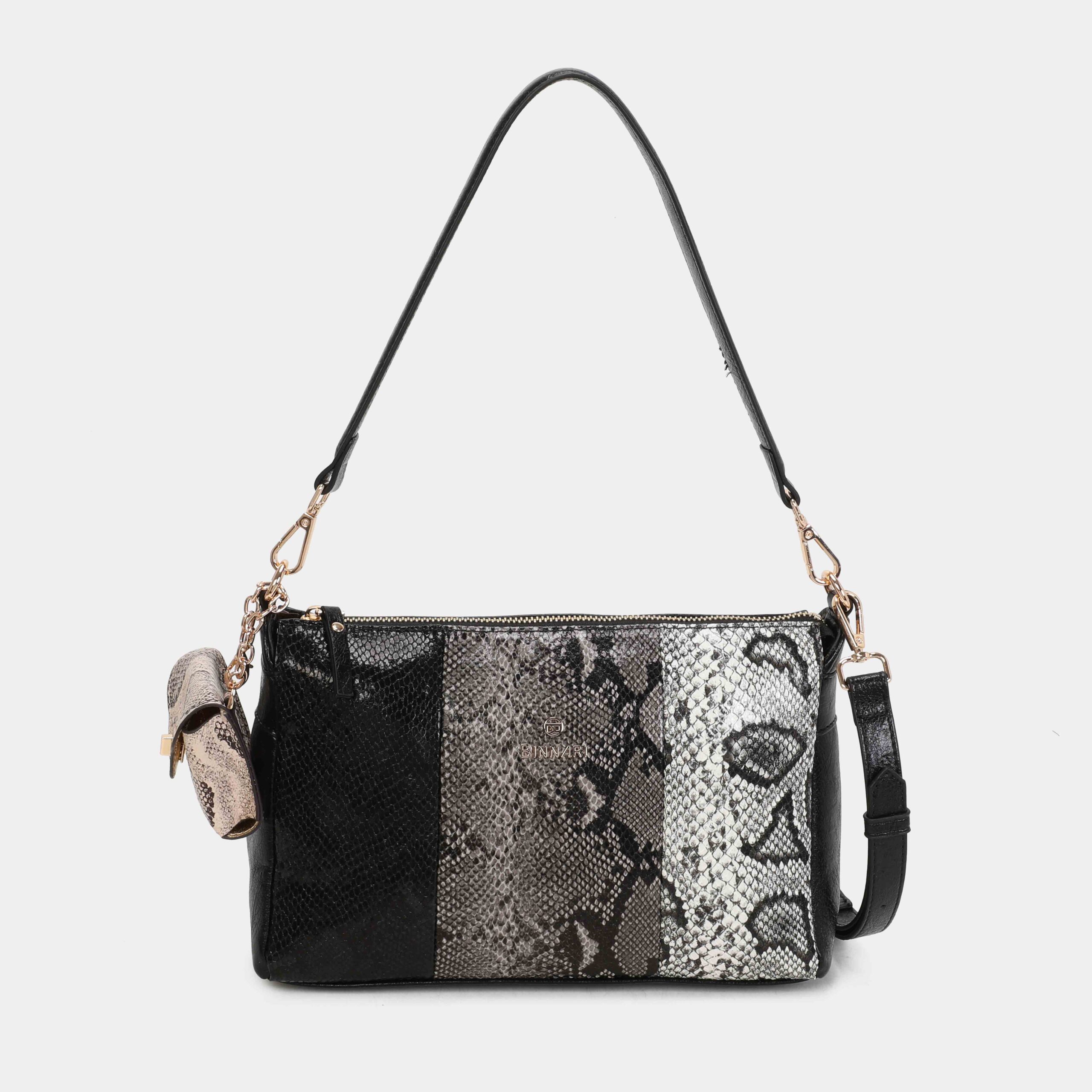 Bolso bandolera Levy disponible en 2 colores y confeccionada en material sintético efecto serpiente Tiene 2 posciones: hombro y bandolera, además de llevar un charm en la parte delantera. En su interior dispone de diversos compartimentos diferentes, a los cuales se accede mediante una cremallera. Los detalles metálicos son de color oro claro .
