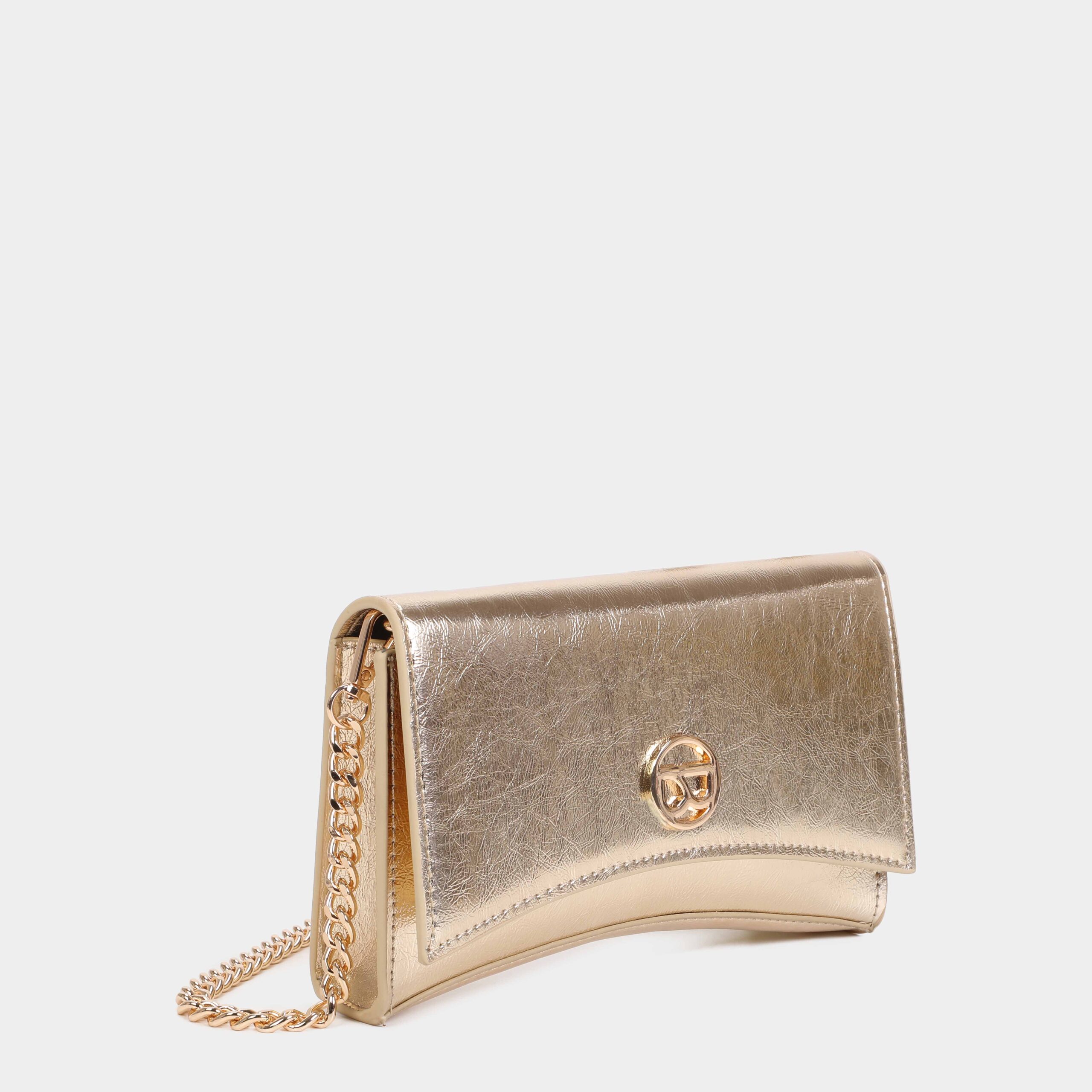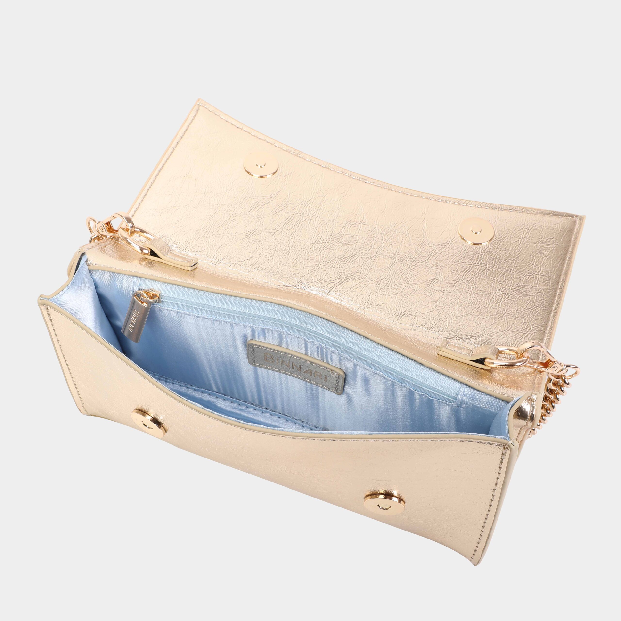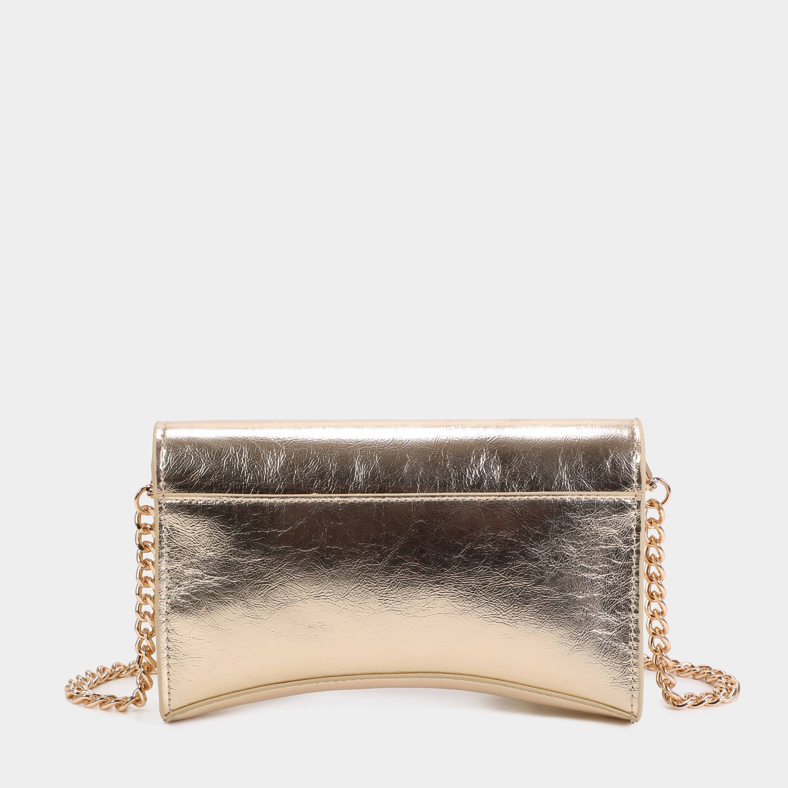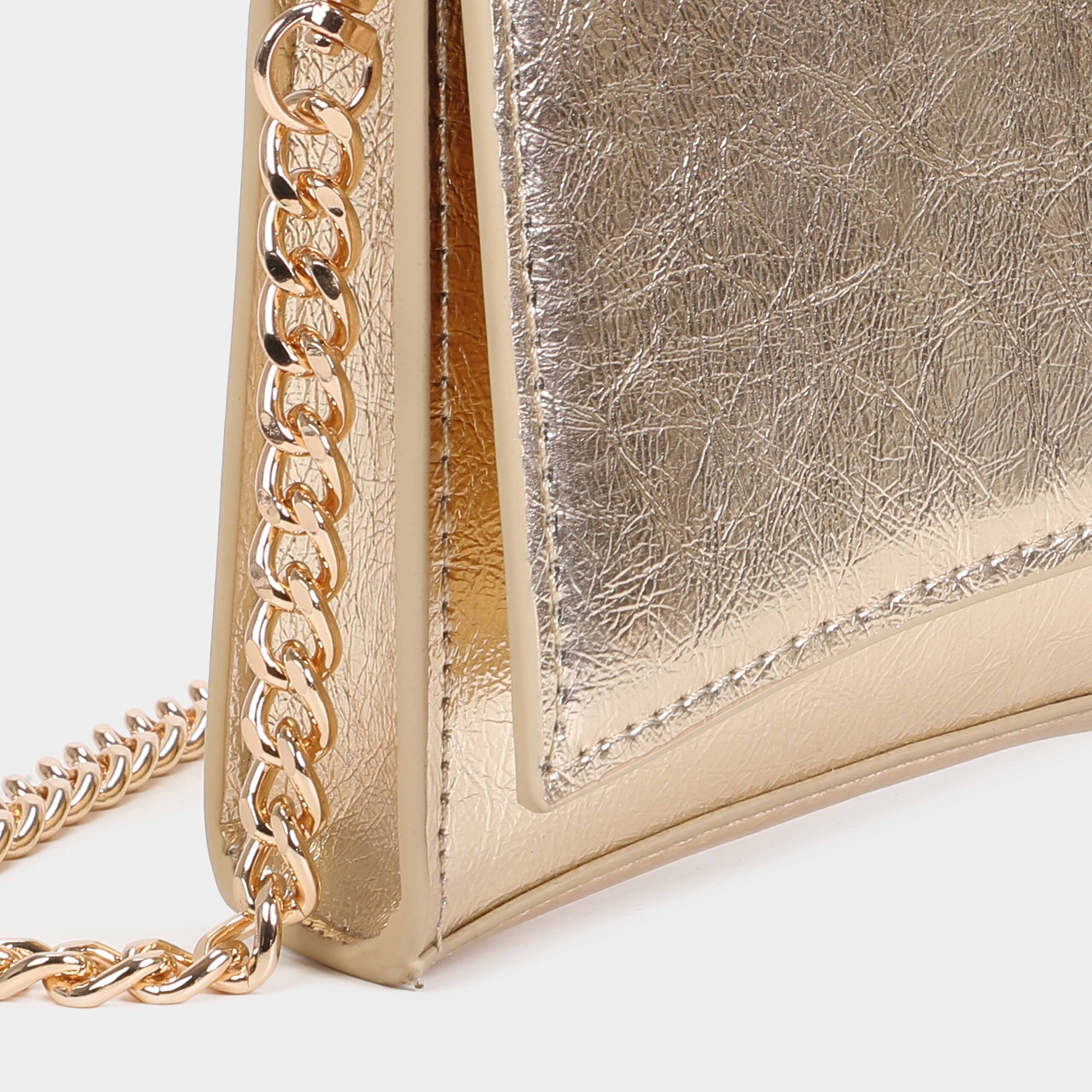 Bolso bandolera Lisa confeccionada en pu de alta calidad.Se accede a su interior por medio de la solapa y en él encontramos varios bolsillos, uno de ellos con cremallera para aportar así una seguridad mayor. Los detalles metálicos son de color oro claro.
