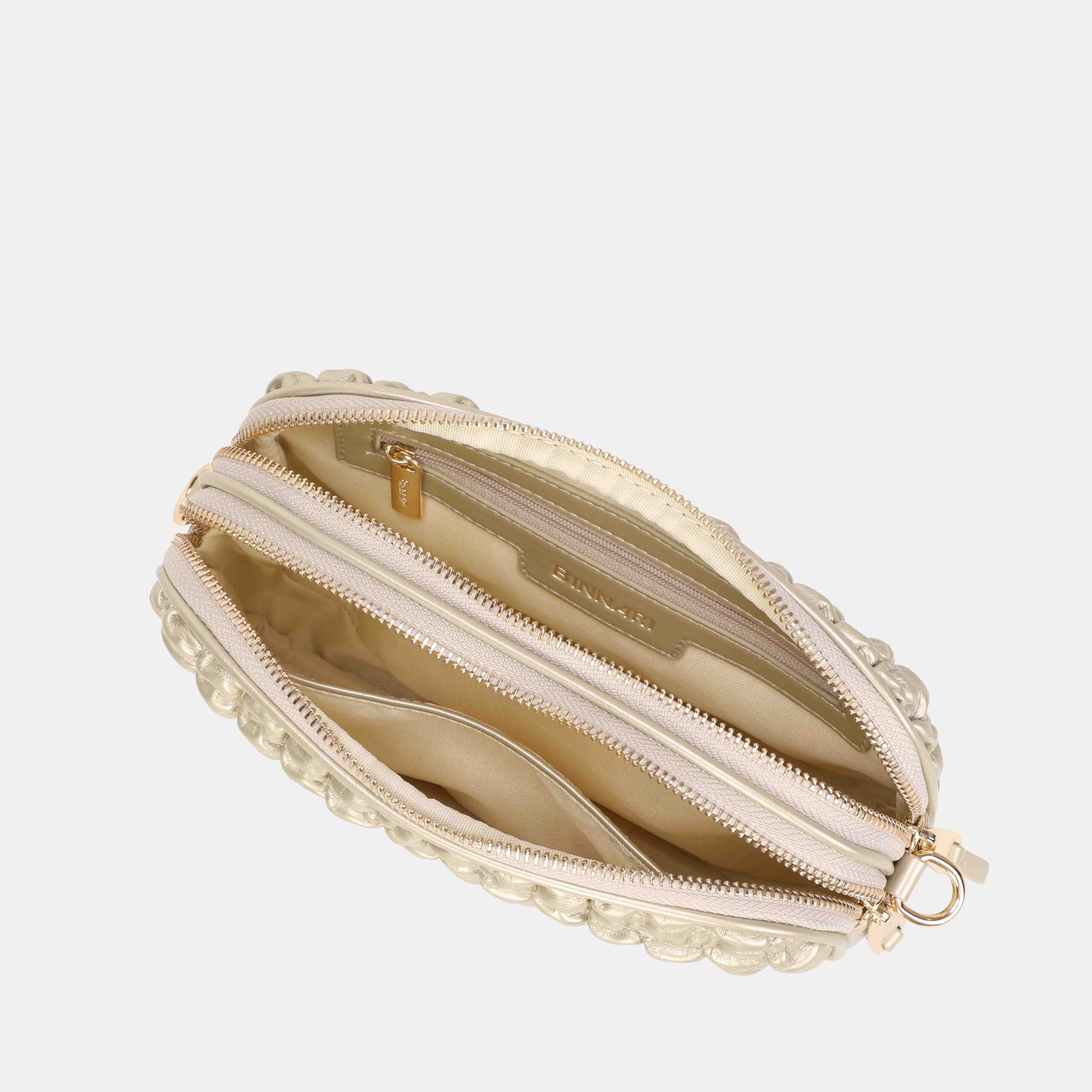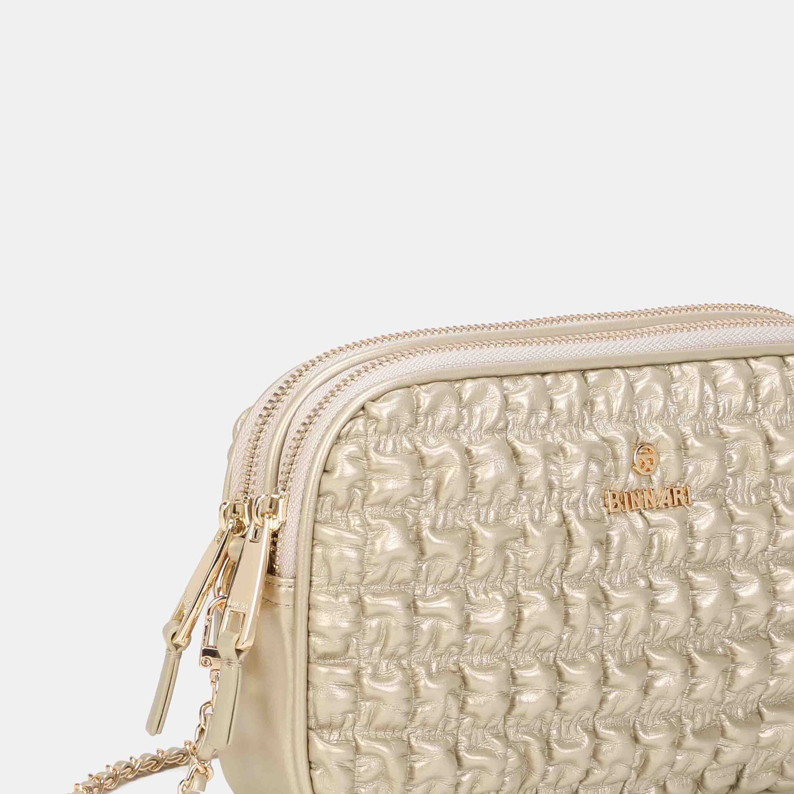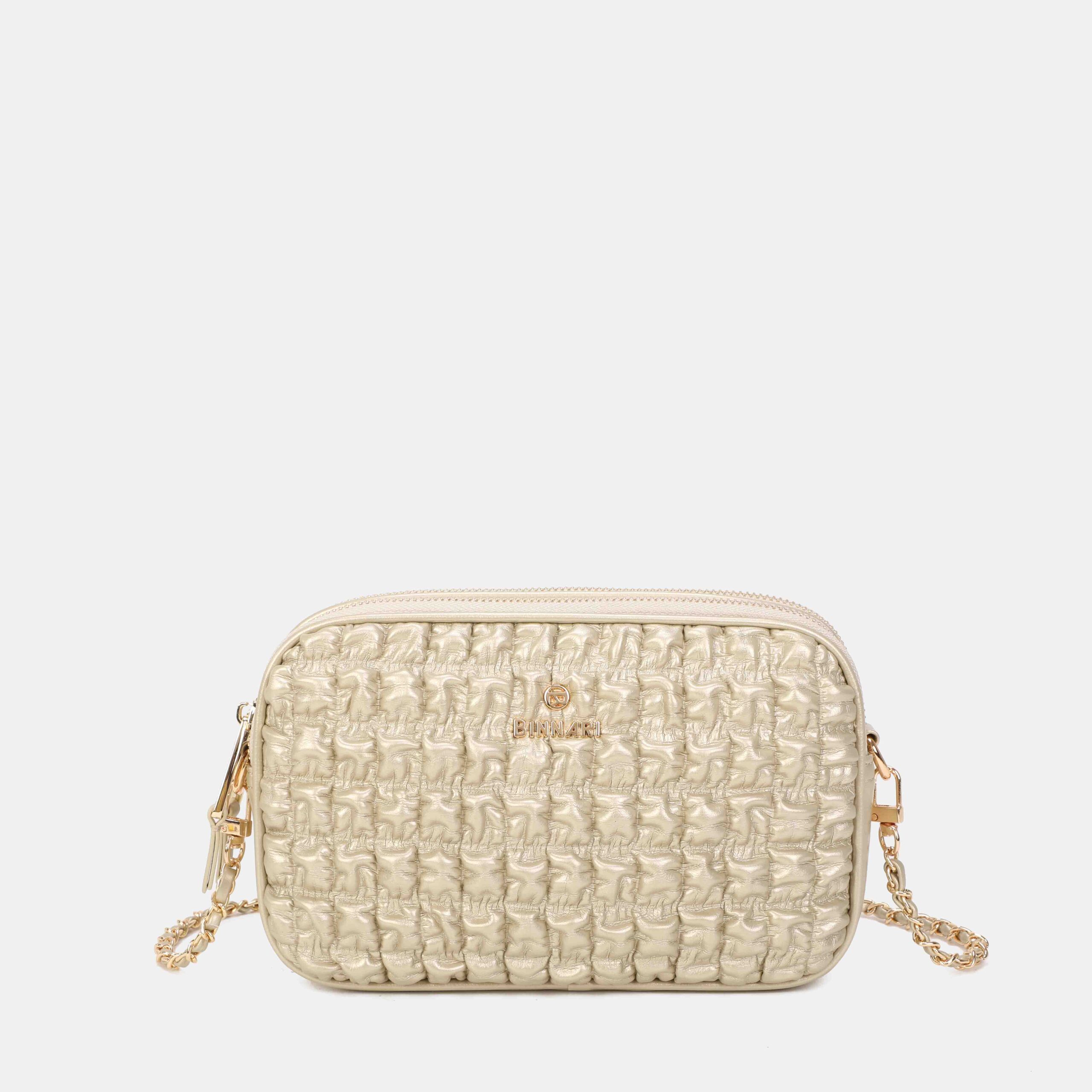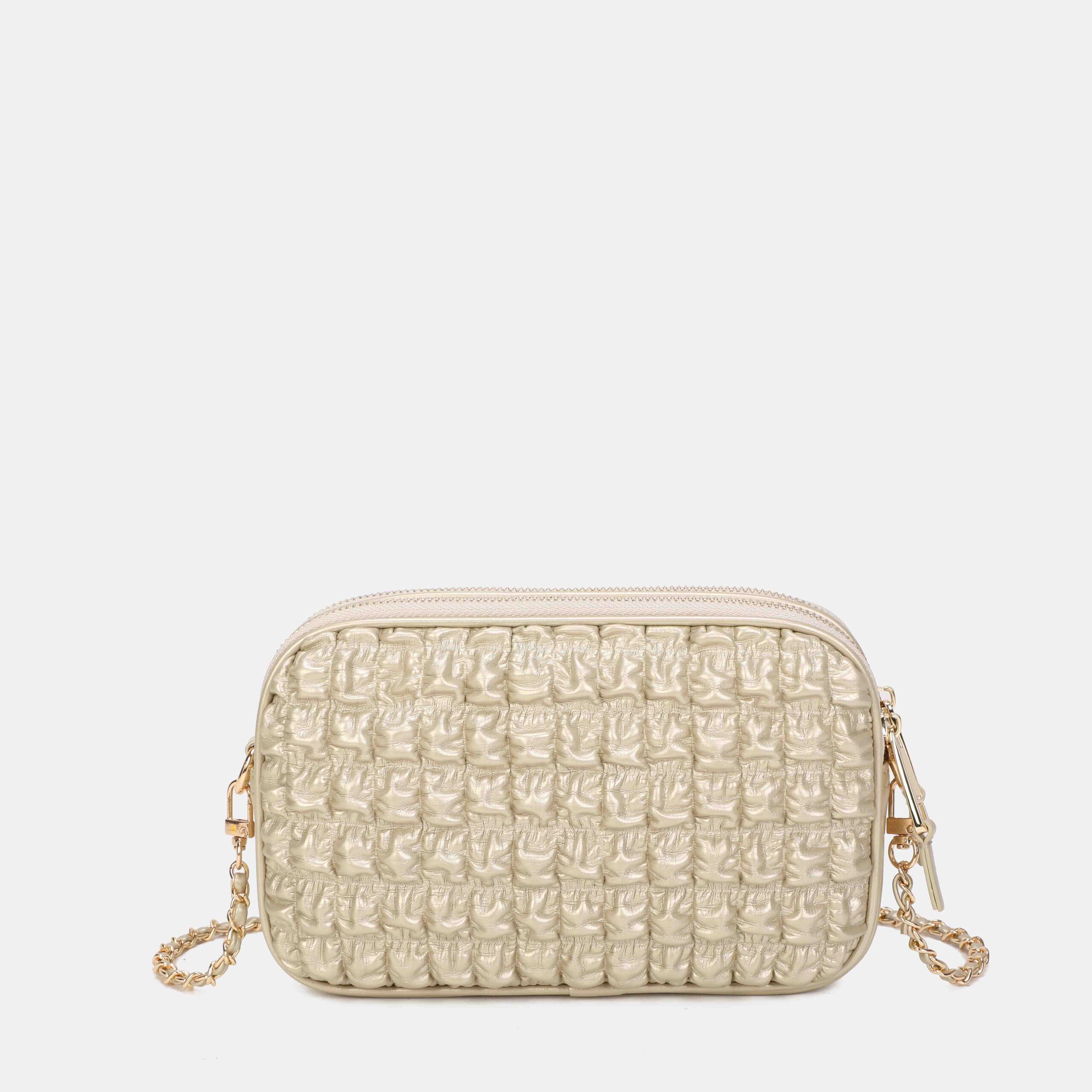 Este diseño en PU acolchado destaca por su textura moderna y su formato compacto. Lleva una cadena metálica ajustable en tono oro, perfecta para lucirlo al hombro o como bandolera. Su compartimento principal con cremallera mantiene todo seguro y ordenado. Un bolso práctico, ligero y muy chic para completar cualquier look.
