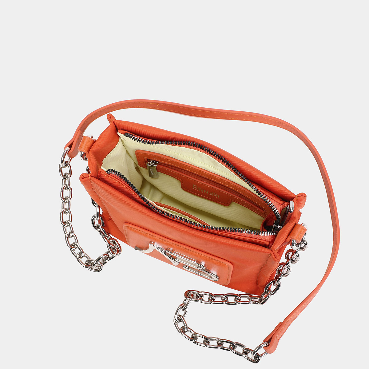 Bolso bandolera Nora confeccionada en nylon reciclado y pu de alta calidad. Está disponible en 5 colores: negro, stone, orange, cielo y lavanda. En la parte frontal tiene un chapón en pu con el logtipo NB Binnari. Se accede al interior por medio de una cremallera superior. En él encontramos diversos bolsillos. Los detalles metálicos son de color nickel.