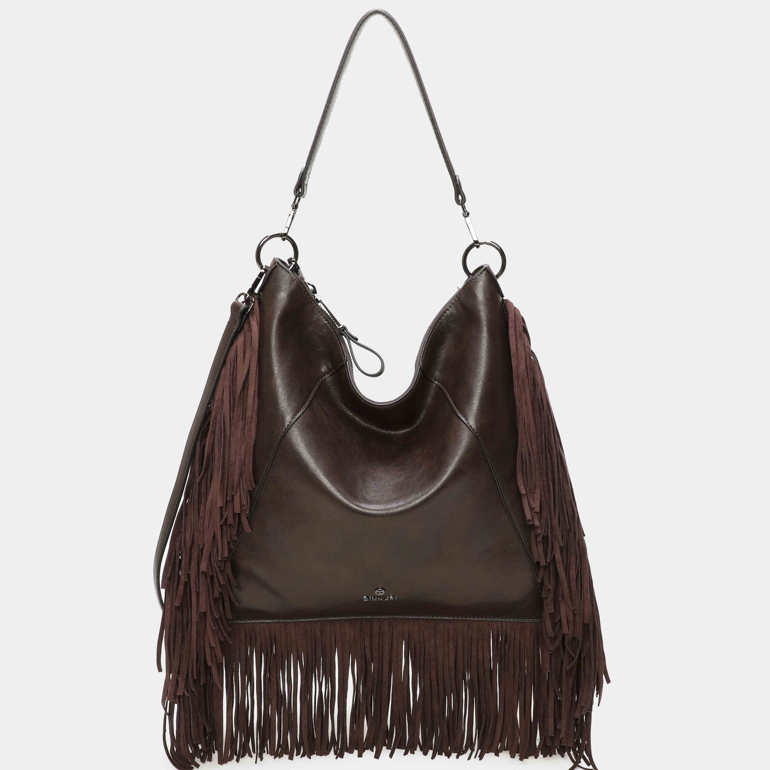 ¡Los flecos vuelven! Bolso hombro Kate confeccionado en pu de alta calidad y flecos de antelina. Está disponible en 4 colores: negro, moka, cuero y bordo, ¿con cuál te quedas? Puedes llevarlos tanto de hombro como de bandolera ya que en su interior tiene una segunda asa ajustable. Bolsillo con cremallera en la parte trasera. Detalles metálicos en color nickel.
