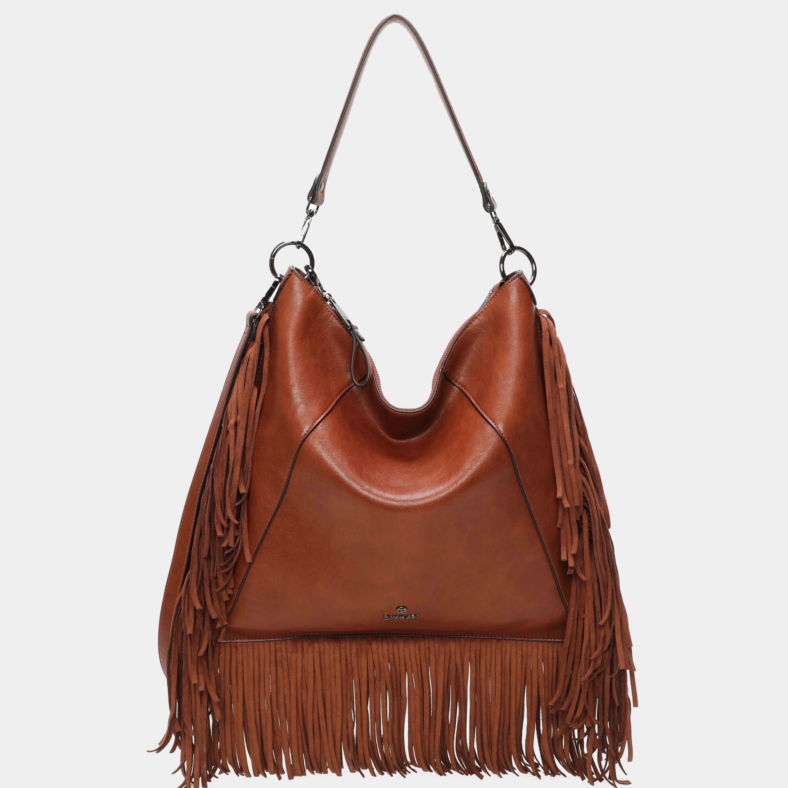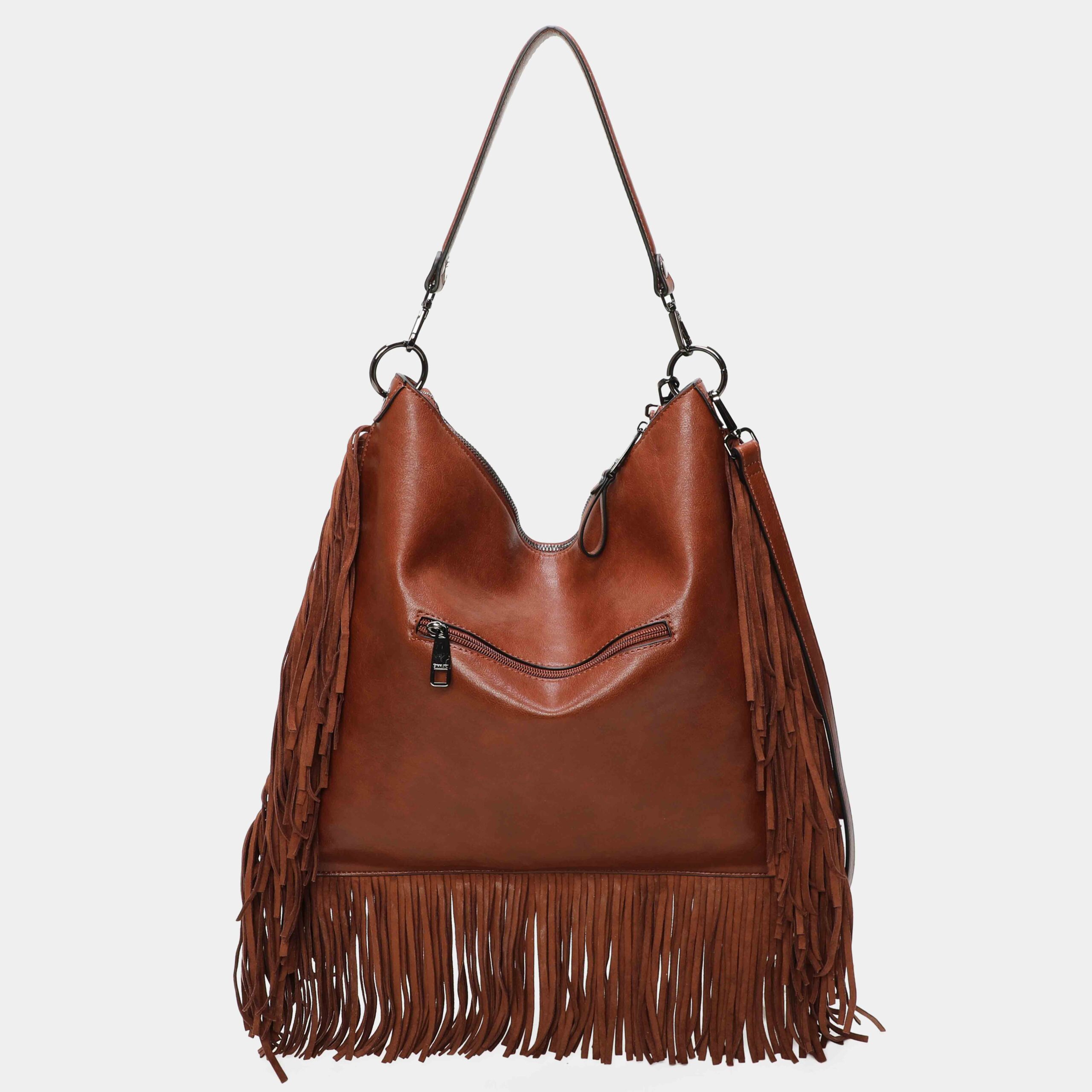 ¡Los flecos vuelven! Bolso hombro Kate confeccionado en pu de alta calidad y flecos de antelina. Está disponible en 4 colores: negro, moka, cuero y bordo, ¿con cuál te quedas? Puedes llevarlos tanto de hombro como de bandolera ya que en su interior tiene una segunda asa ajustable. Bolsillo con cremallera en la parte trasera. Detalles metálicos en color nickel.