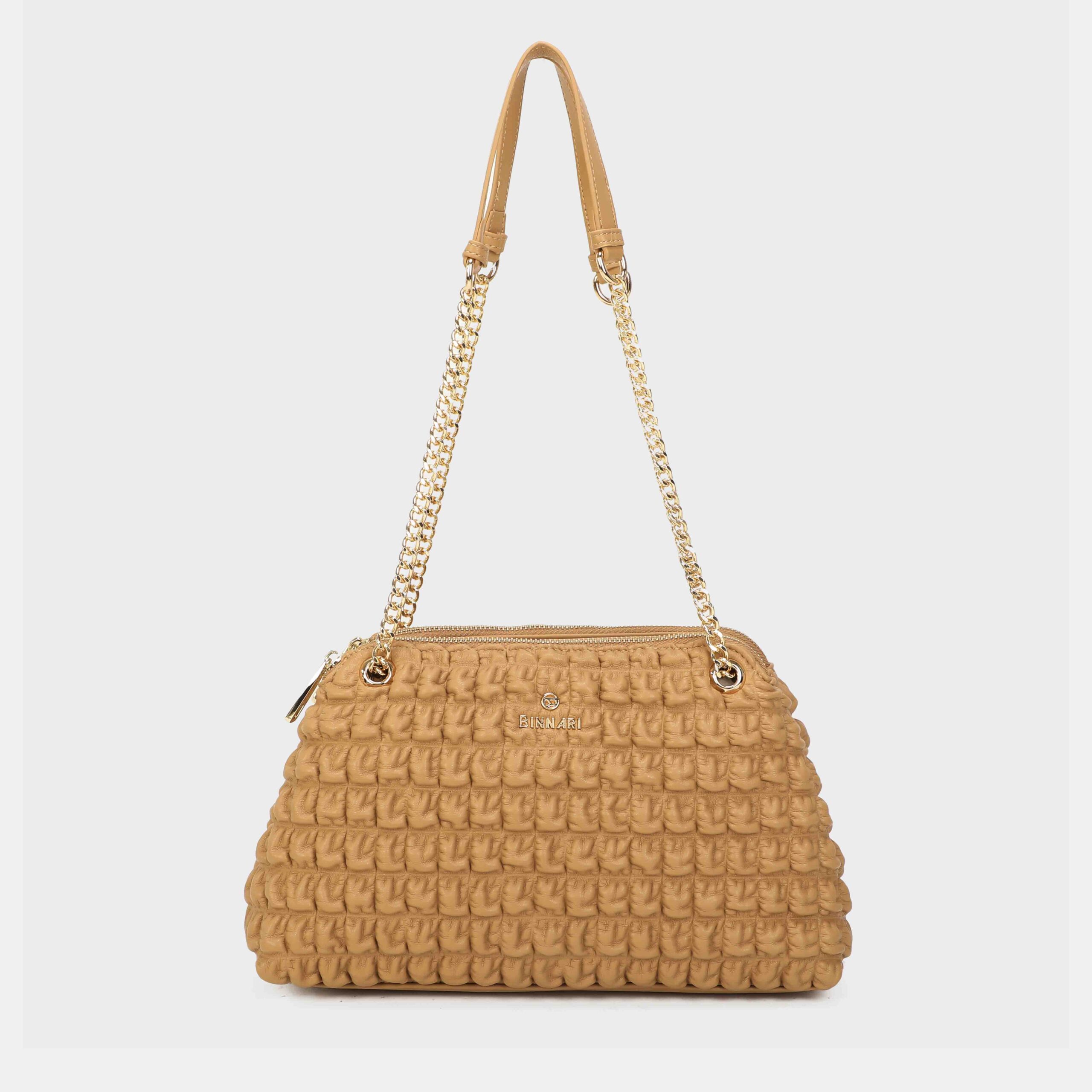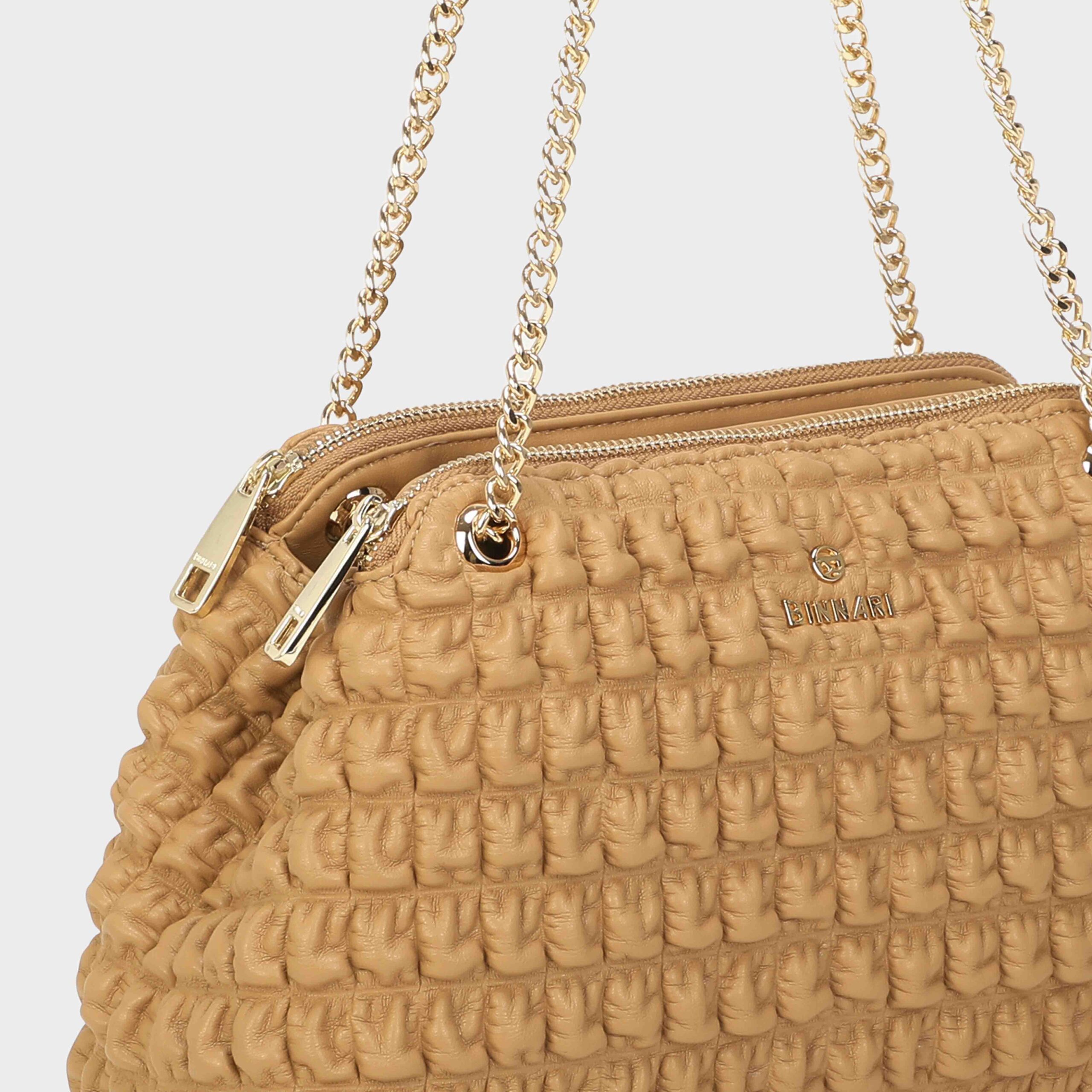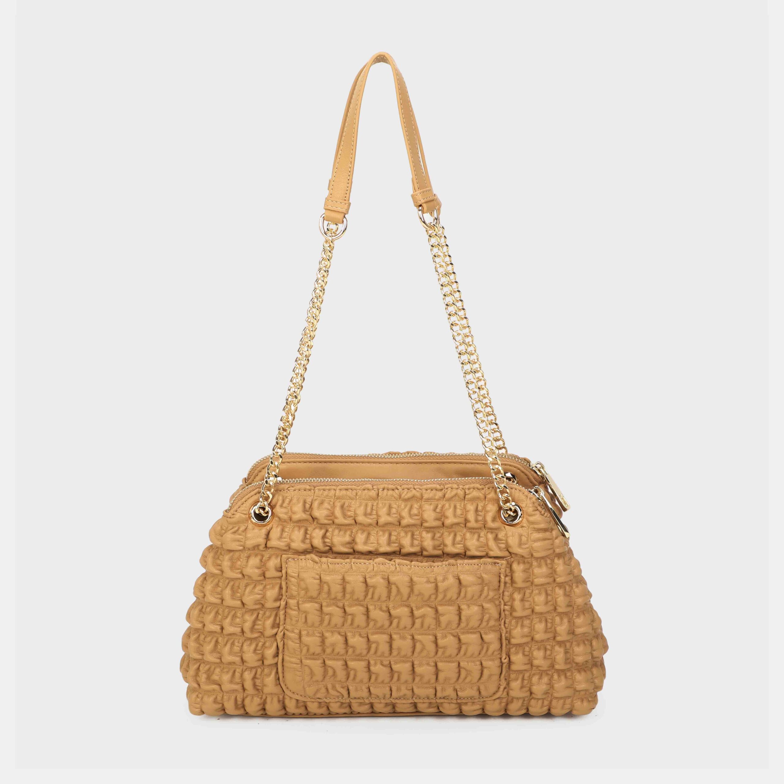 Bolso de PU acolchado con un diseño moderno, ligero y muy agradable al tacto. Cuenta con una cadena metálica en tono oro combinada con un tramo ajustable en PU para mayor comodidad. Su interior está dividido en tres compartimentos, ideal para mantener todo bien organizado. Un bolso de tamaño mediano, práctico y elegante, perfecto para lucirlo tanto de día como de noche.