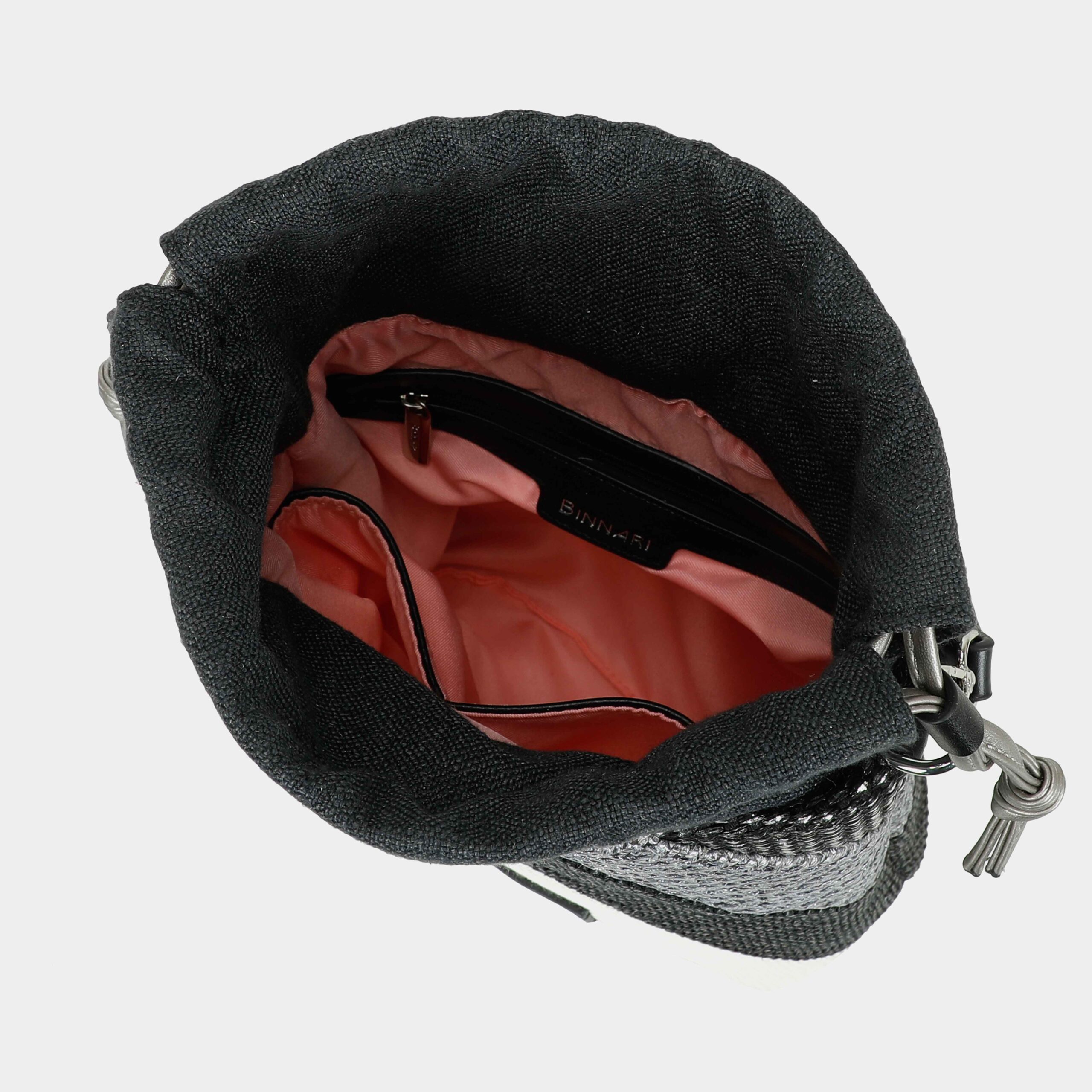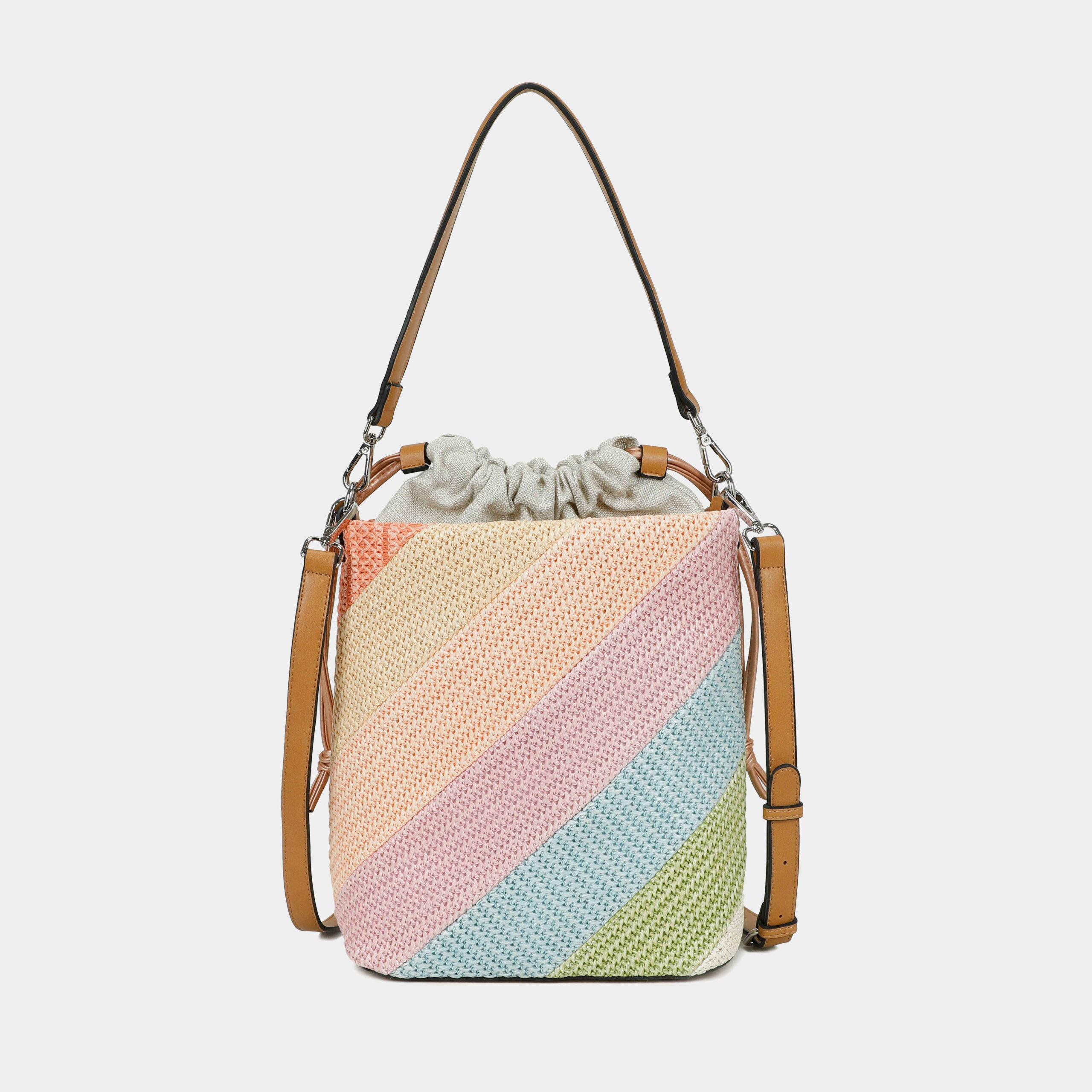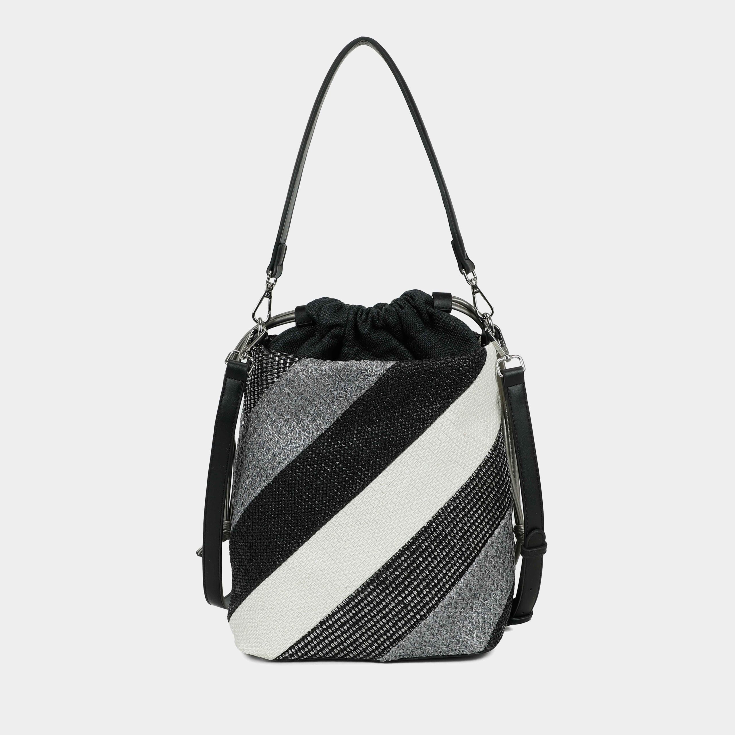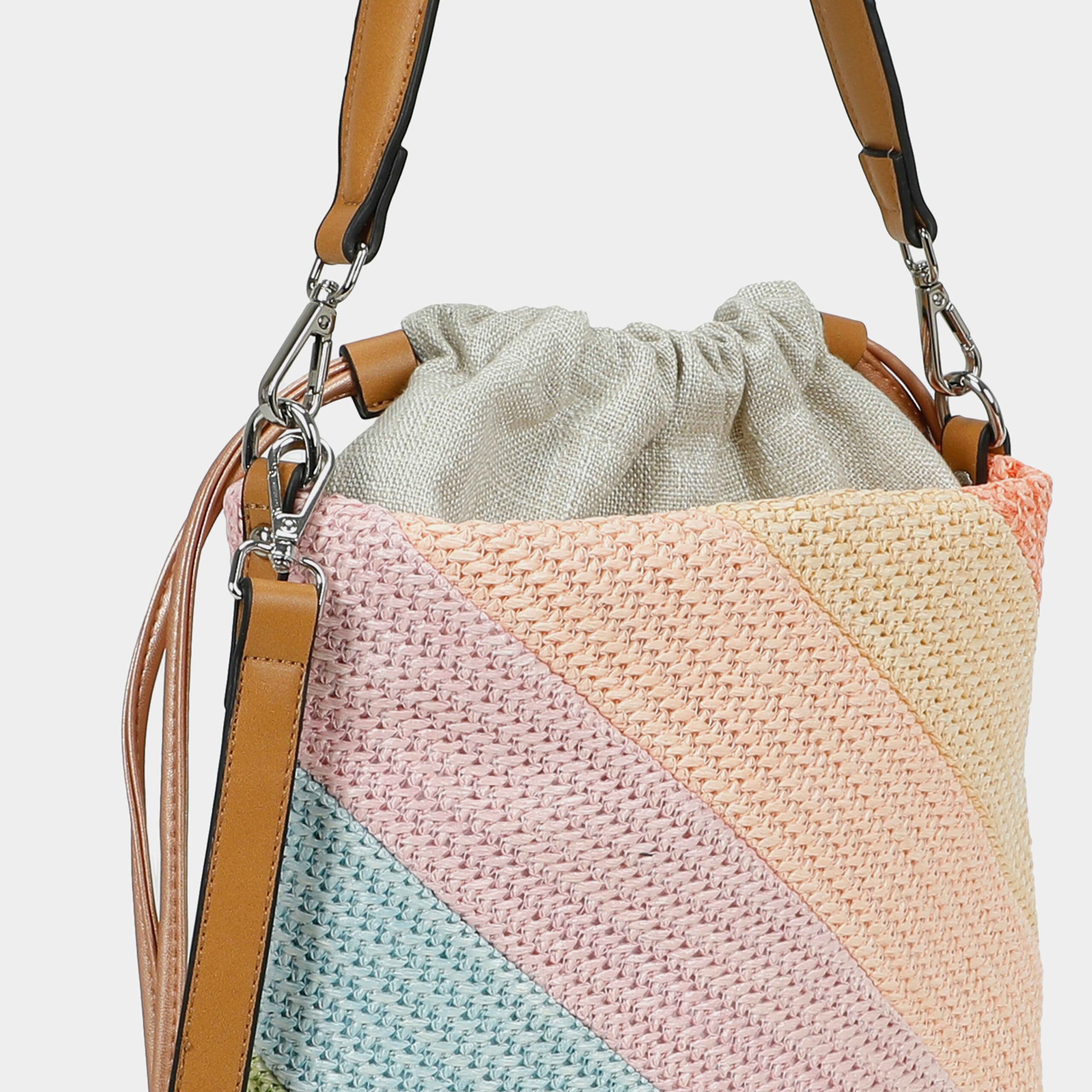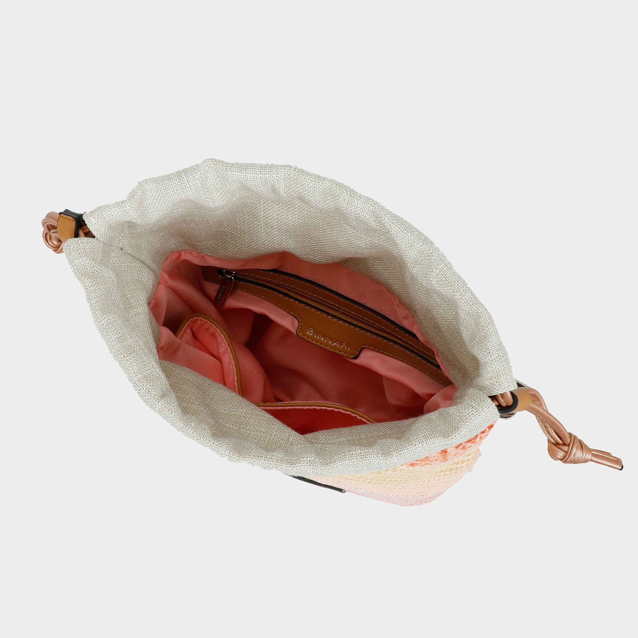 - Confeccionado en rafia y textil (bolsa del interior)