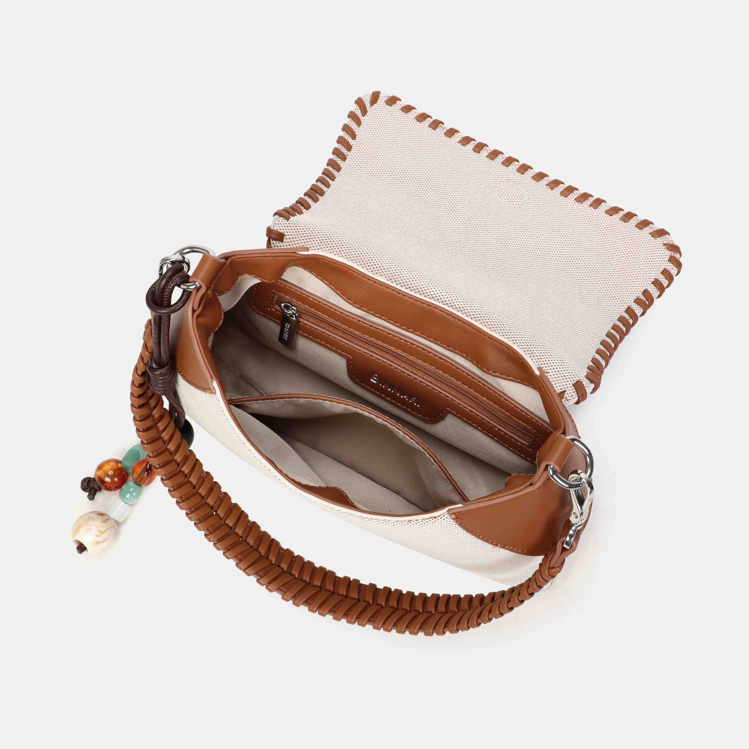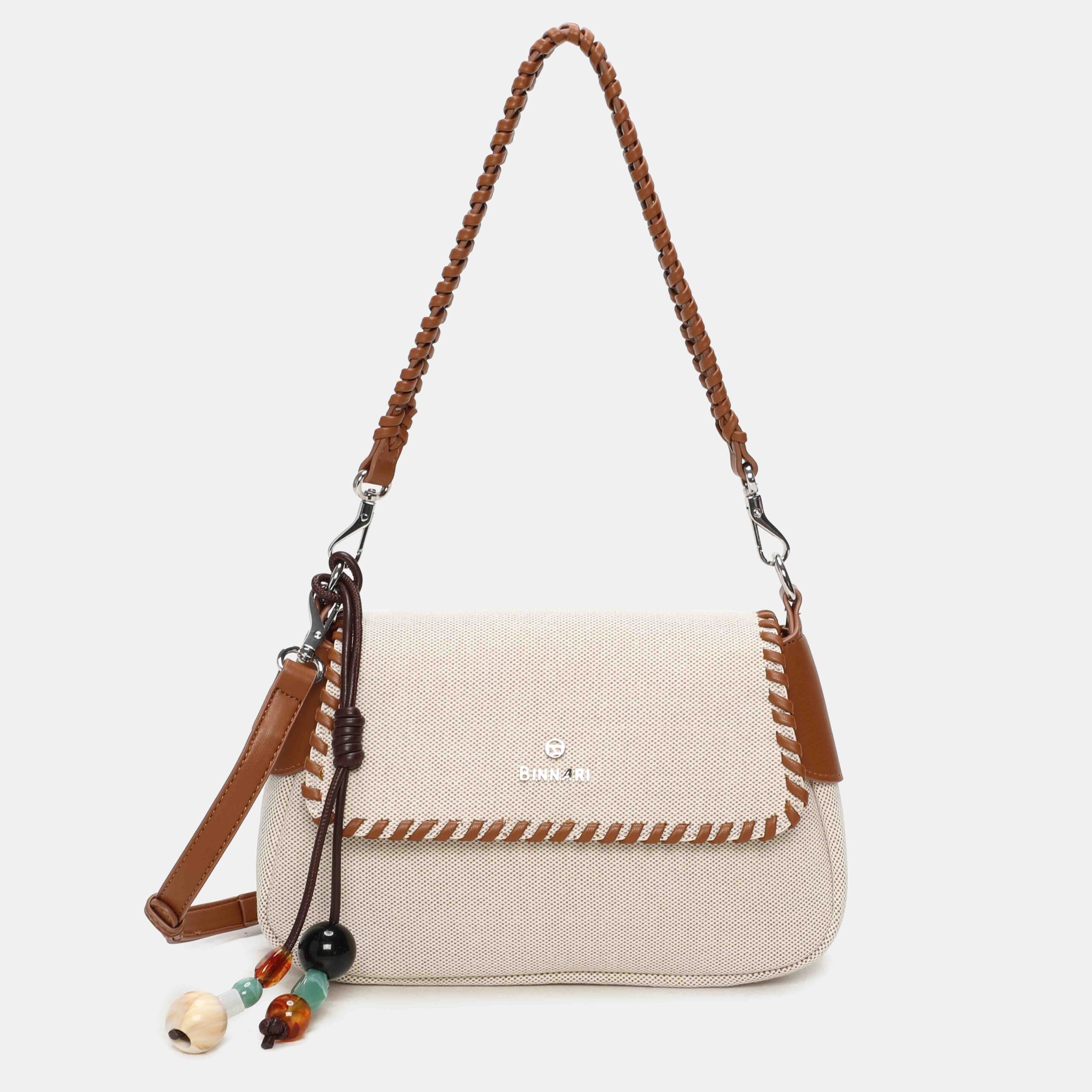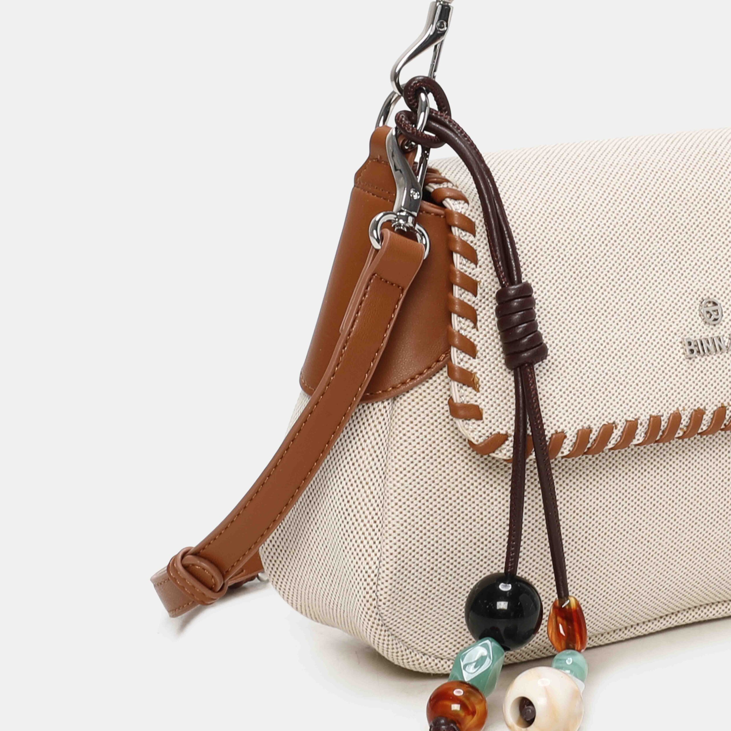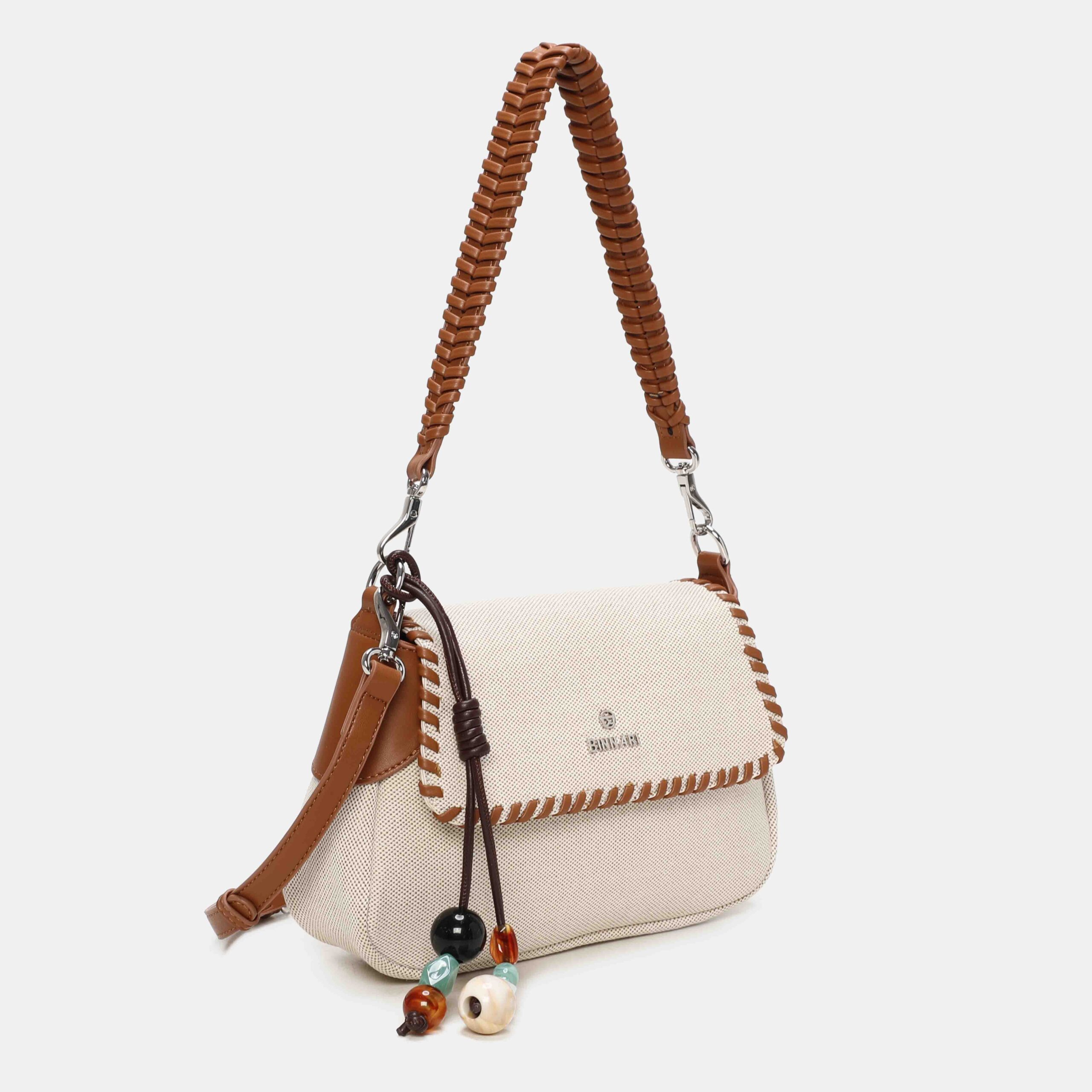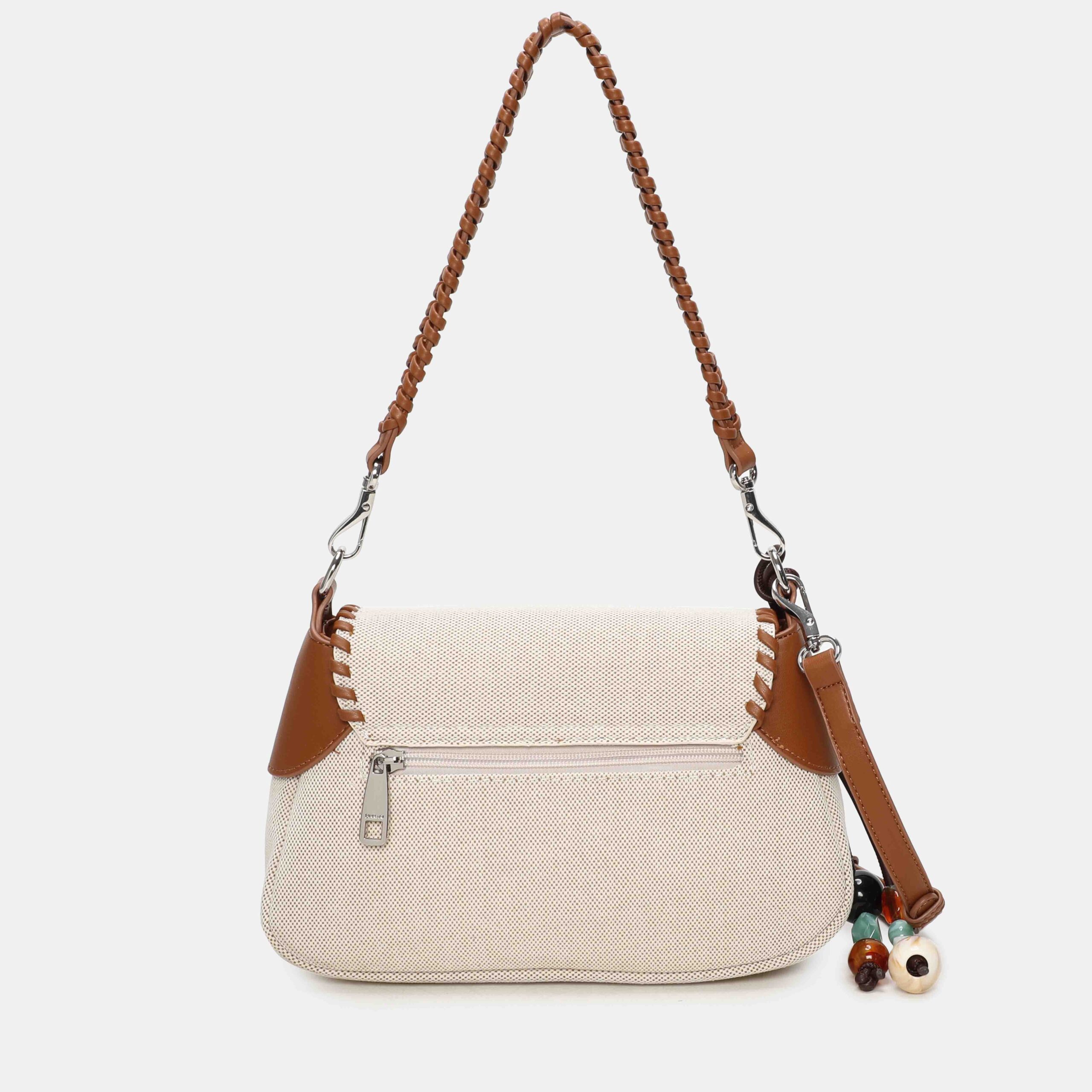 Con un estilo fresco ,este bolso está confeccionado en material textil y rematado con cantos en PU trenzado, que le aportan un acabado muy especial. Incluye un detalle decorativo extraíble con cuentas, perfecto para darle un toque único al diseño. Su asa trenzada permite llevarlo cómodamente al hombro. Un modelo original, ligero y perfecto para completar tus looks de temporada.