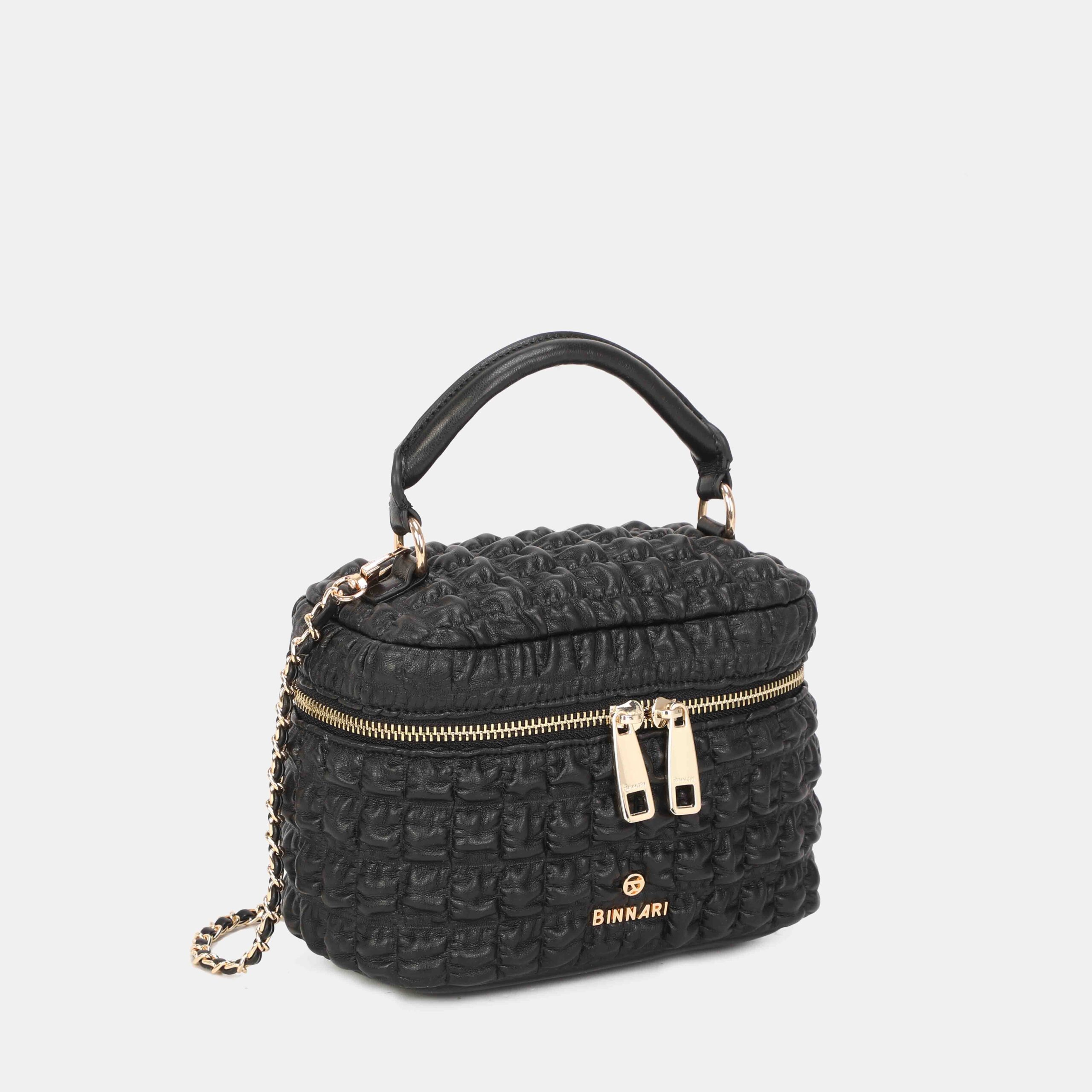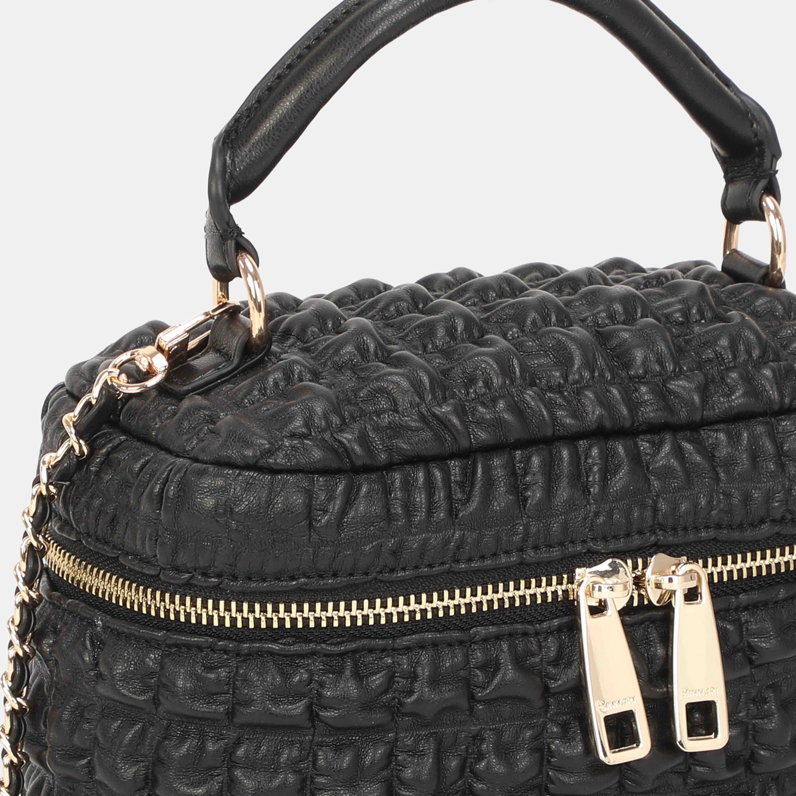 Este bolso tipo joyero, confeccionado en PU acolchado, destaca por su estructura compacta y su acabado texturizado tan especial. Incorpora un asa superior para llevarlo cómodamente en la mano y una cadena metálica en tono oro para usarlo como bandolera. Su apertura con doble cremallera facilita el acceso y mantiene tus cosas bien organizadas. Un diseño original, coqueto y perfecto para darle un toque diferente a tus looks.
