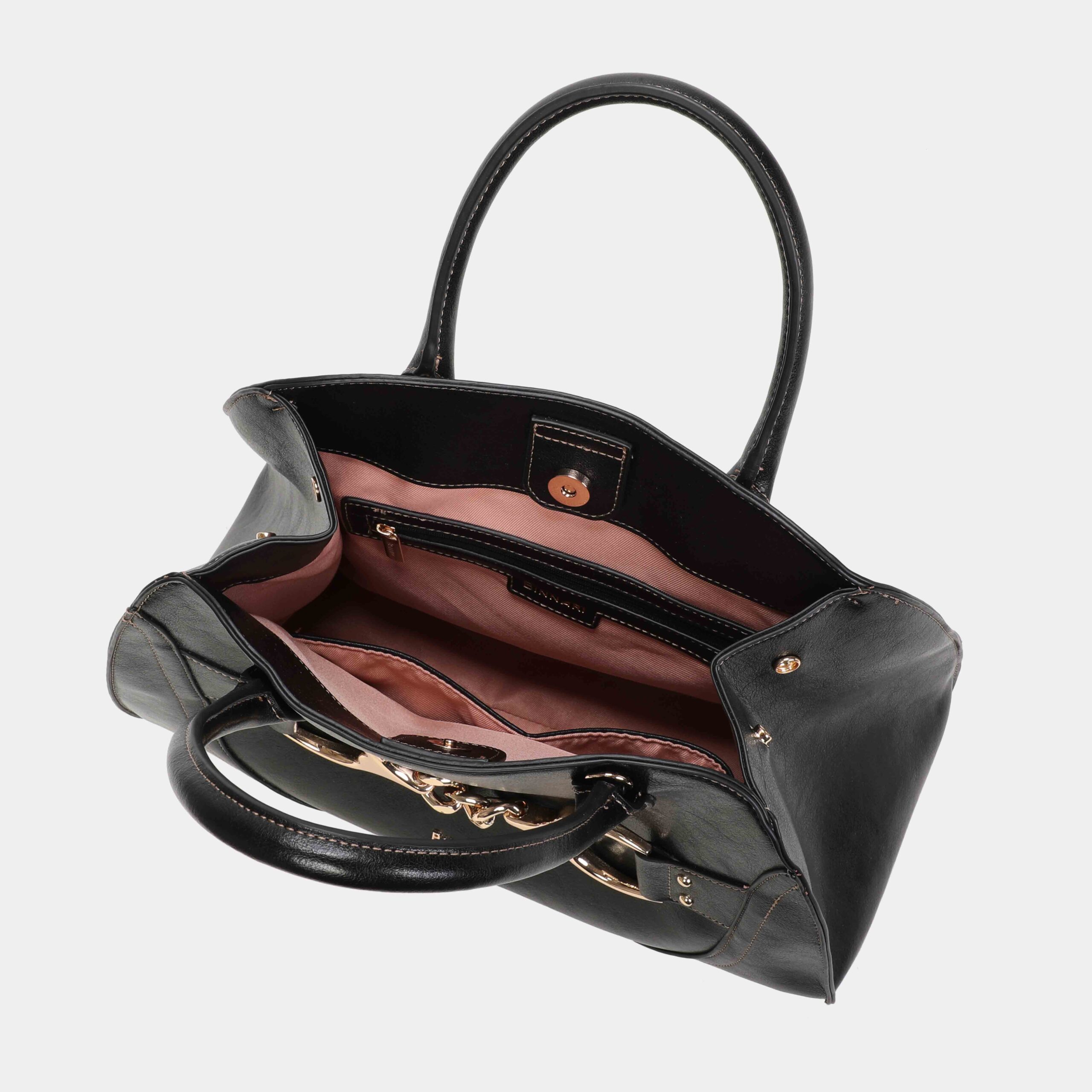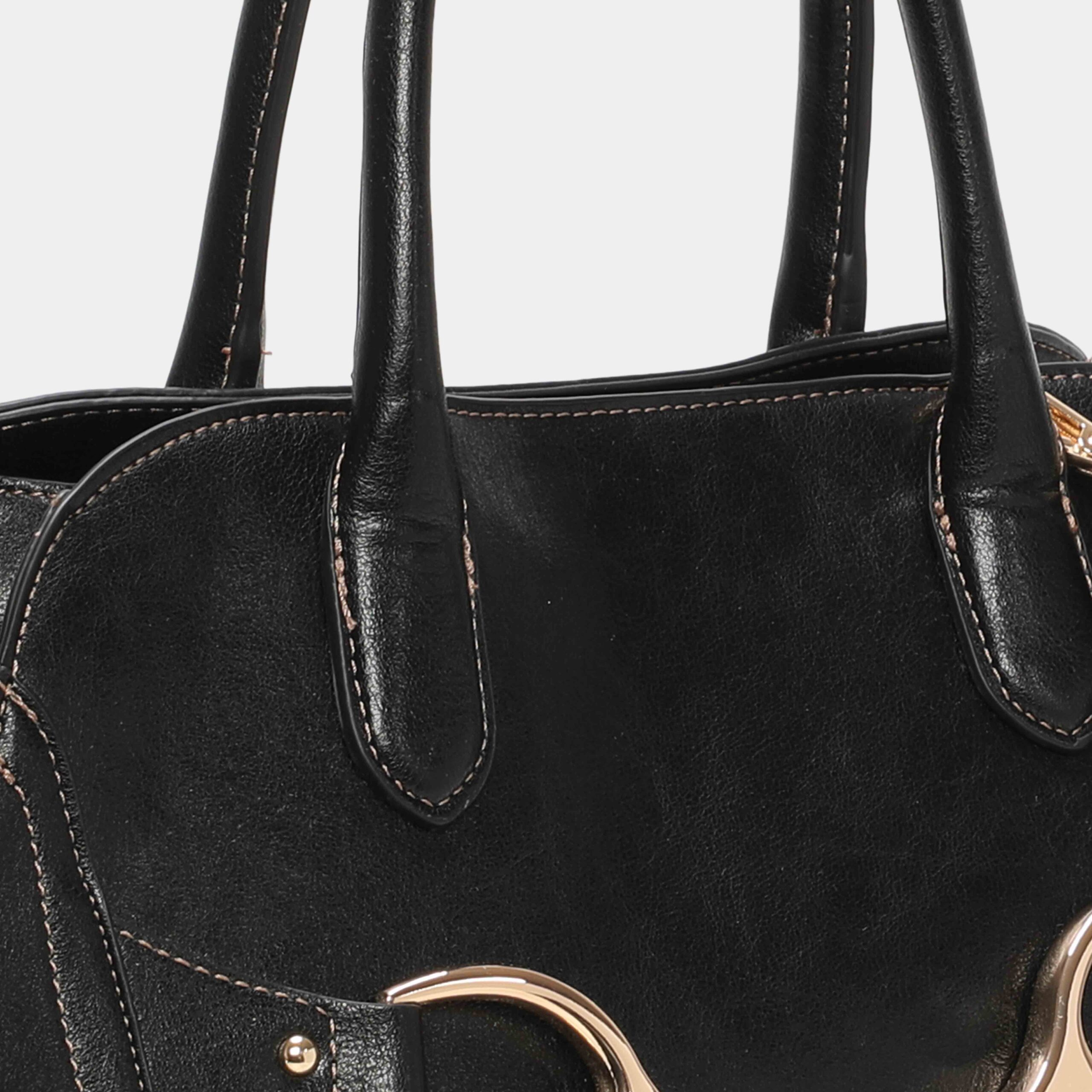 Bolso mano Fanny confeccionado en pu de alta calidad. Disponible en 3 colores. Tiene 1 compartimento grande en así como un bolsillo con cremallera. Tiene un asa en su interior para poder llevarlo como bandolera, 2 en 1. Los detalles decorativos son de color oro claro.