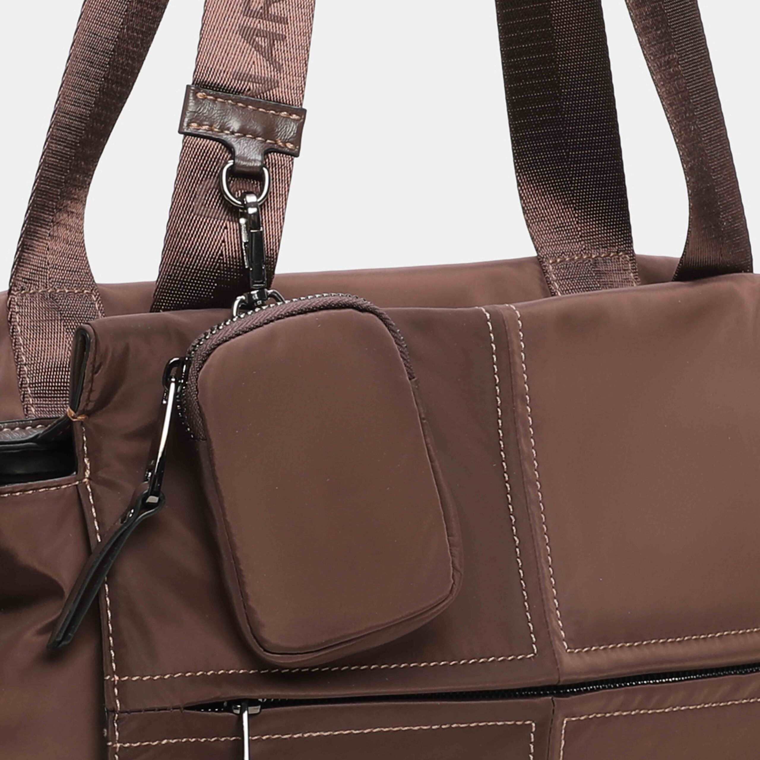 Bolso shopper Alina confeccionada en nylon reciclado. Está disponible en 4 colores: negro, kaki, taupe y marrón. De tamaño grande capaz de guardar todo lo necesario. Además tiene un bolsito extraible en la parte frontal. Los detalles metálicos son de color nickel. ¿Te gusta?