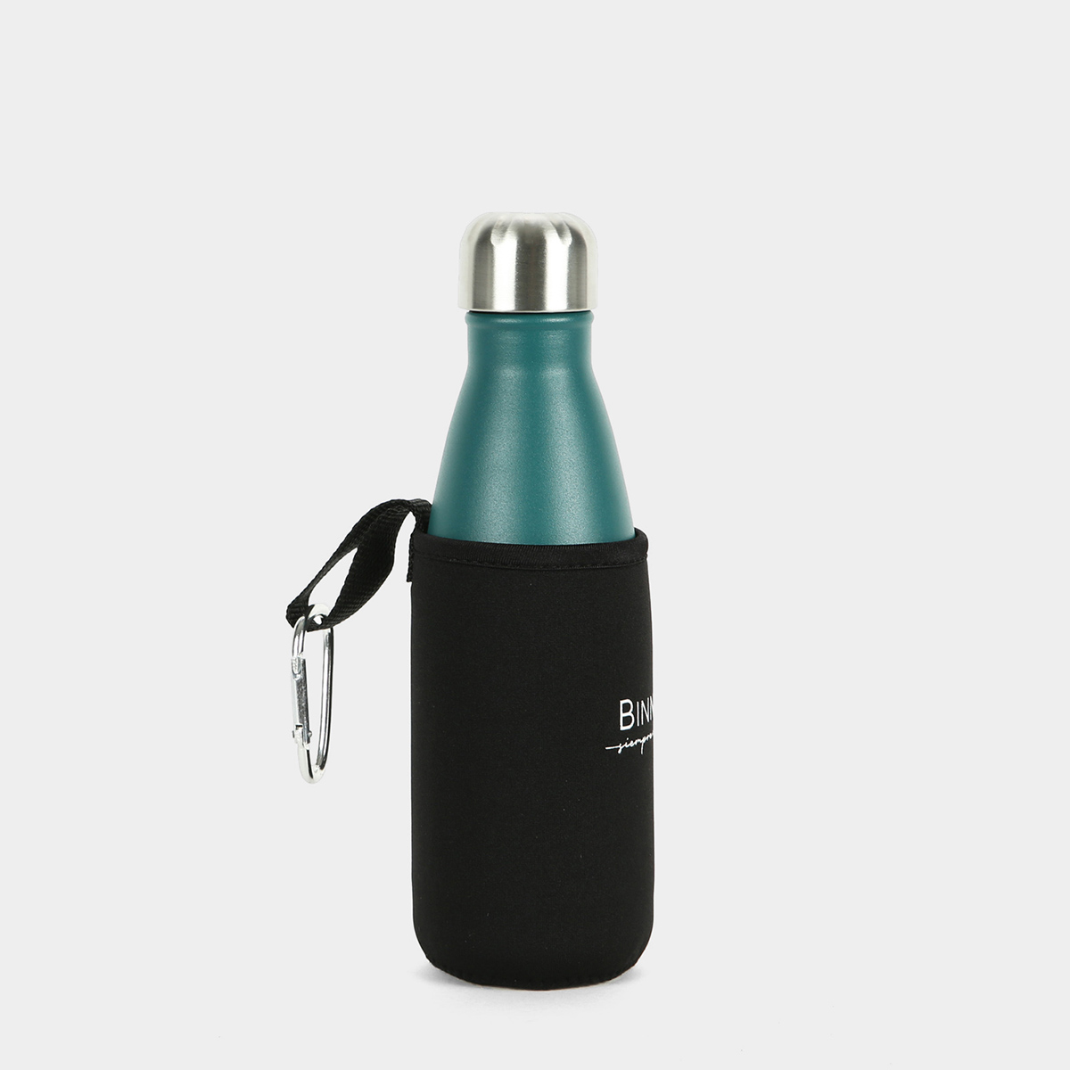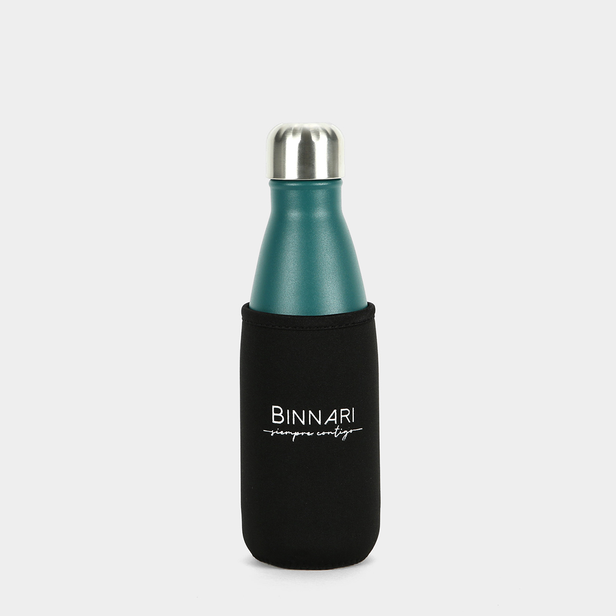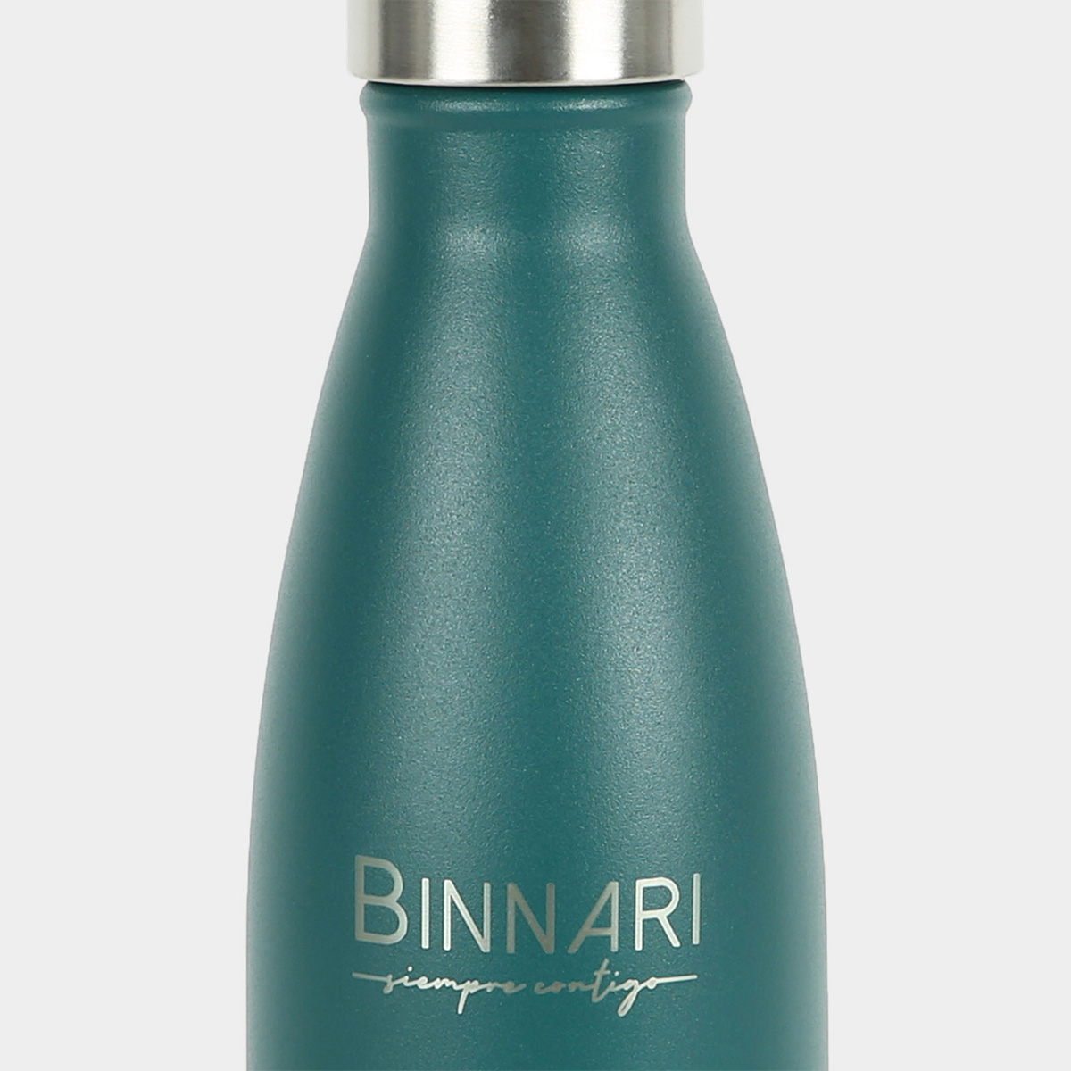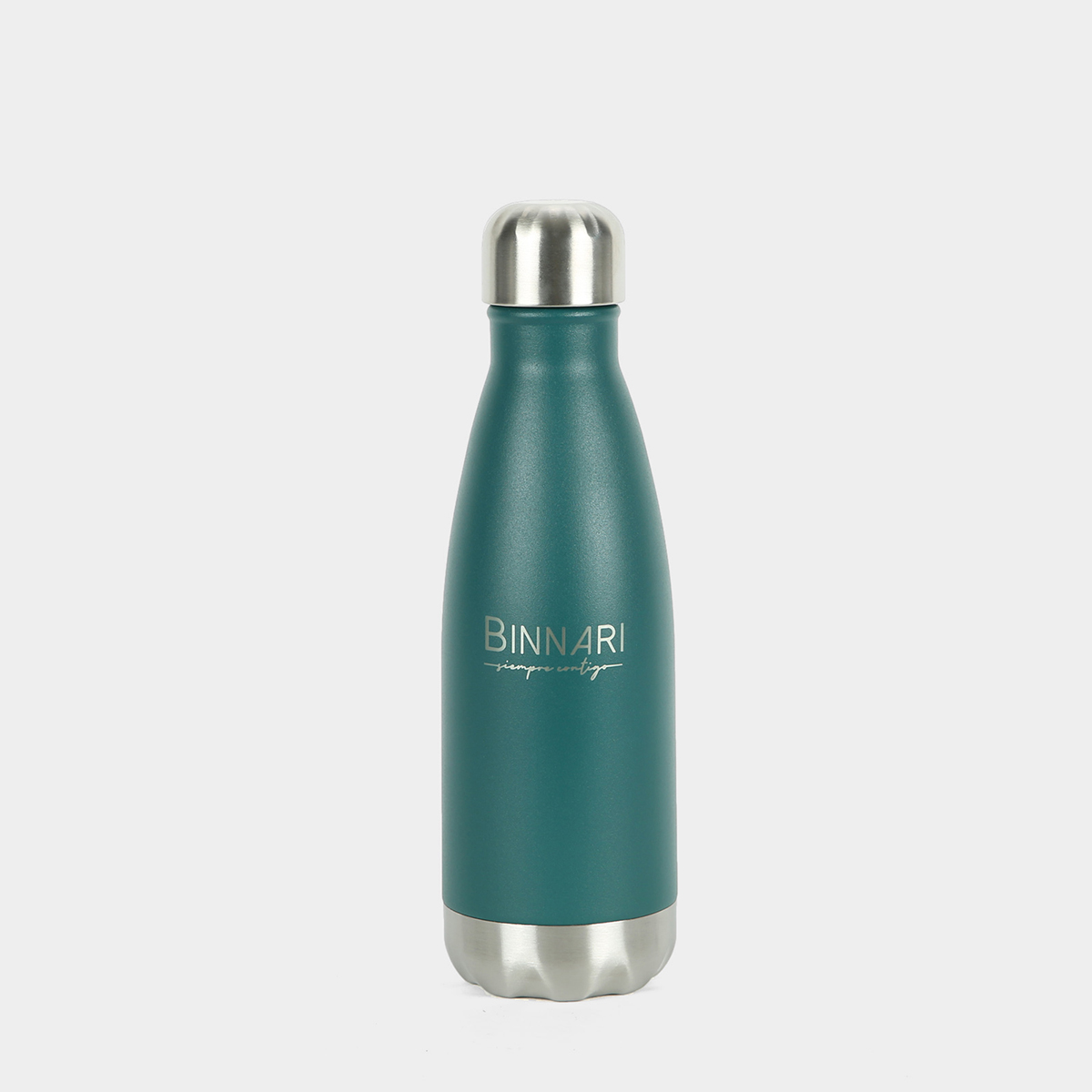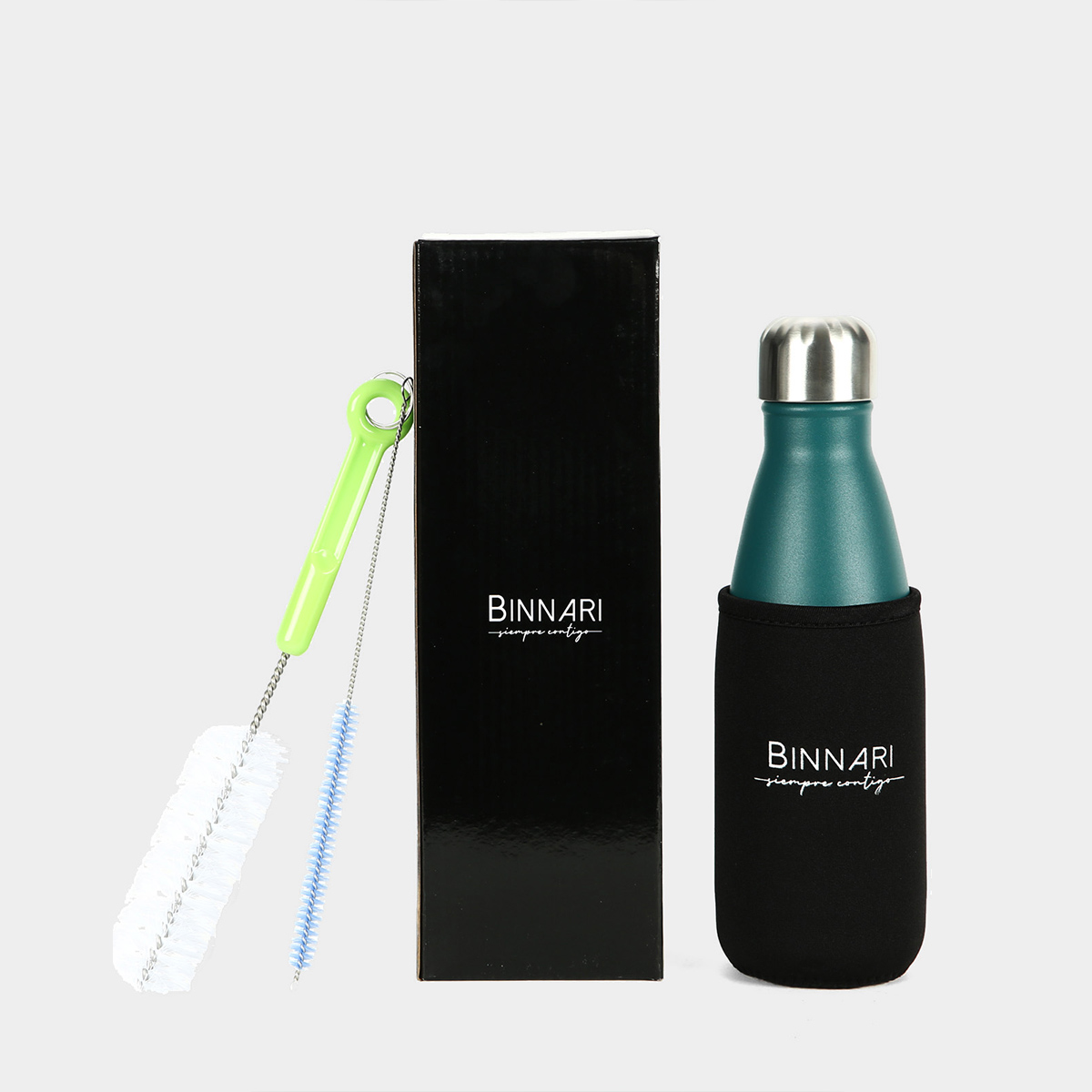 Botella reutilizable con capacidad de 350 cl con aislamiento al vacio de Binnari en color verde. Fabricada con acero inoxidable de alta calidad para la capa interior y exterior para preservar el sabor y el frescor de la bebida sin ninguna contaminación. El aislamiento al vacío significa que la botella se mantendrá sin condensación. Mantiene caliente tu té o café durante 24 horas y las bebidas heladas durante 12 horas, sin importar la temperatura exterior. Tapón de rosca hermético que previene las bolsas mojadas y los derramamientos accidentales. Además, el pack incluye una funda con un colgador y dos escobillas limpiadoras para facilitar la limpieza de su interior y exterior.