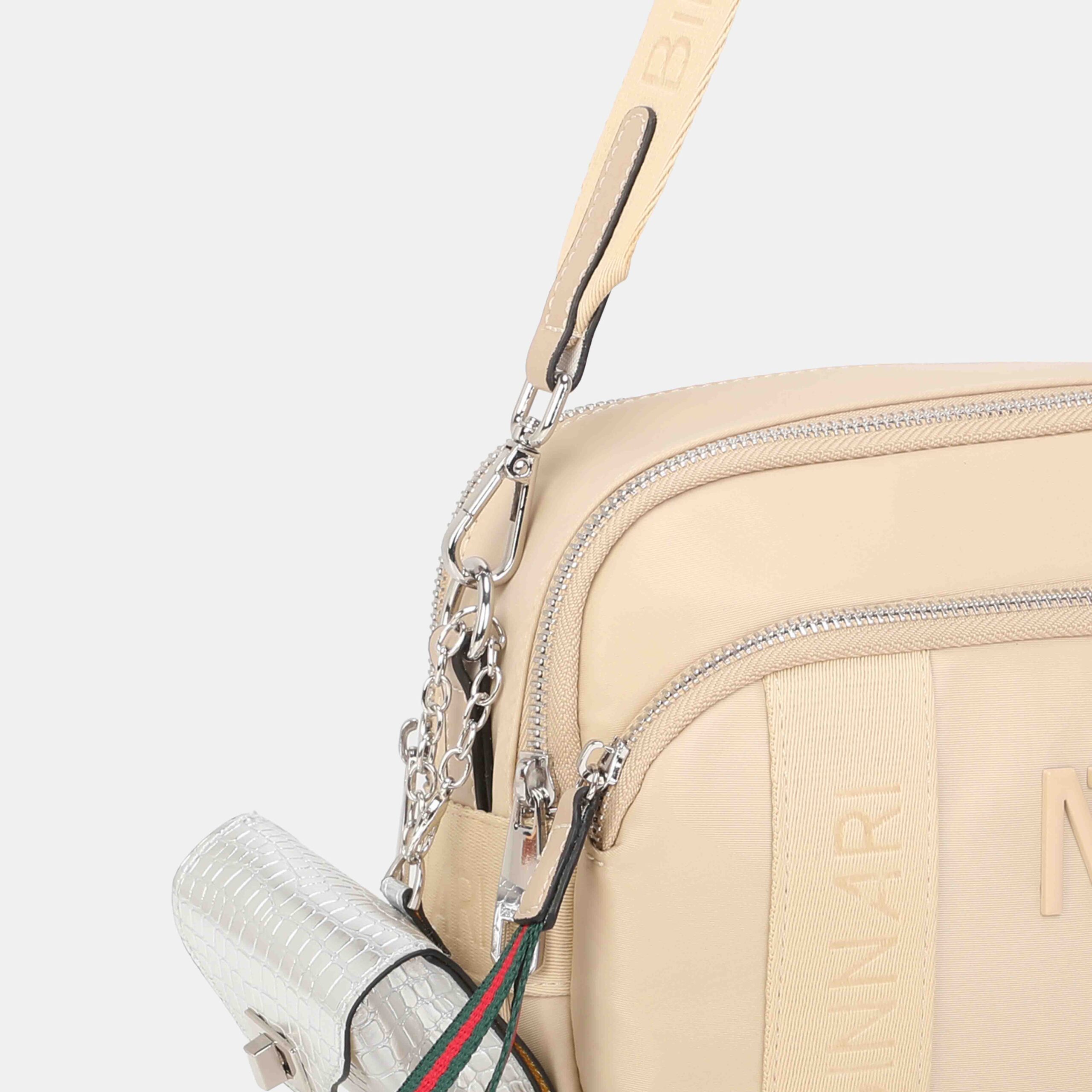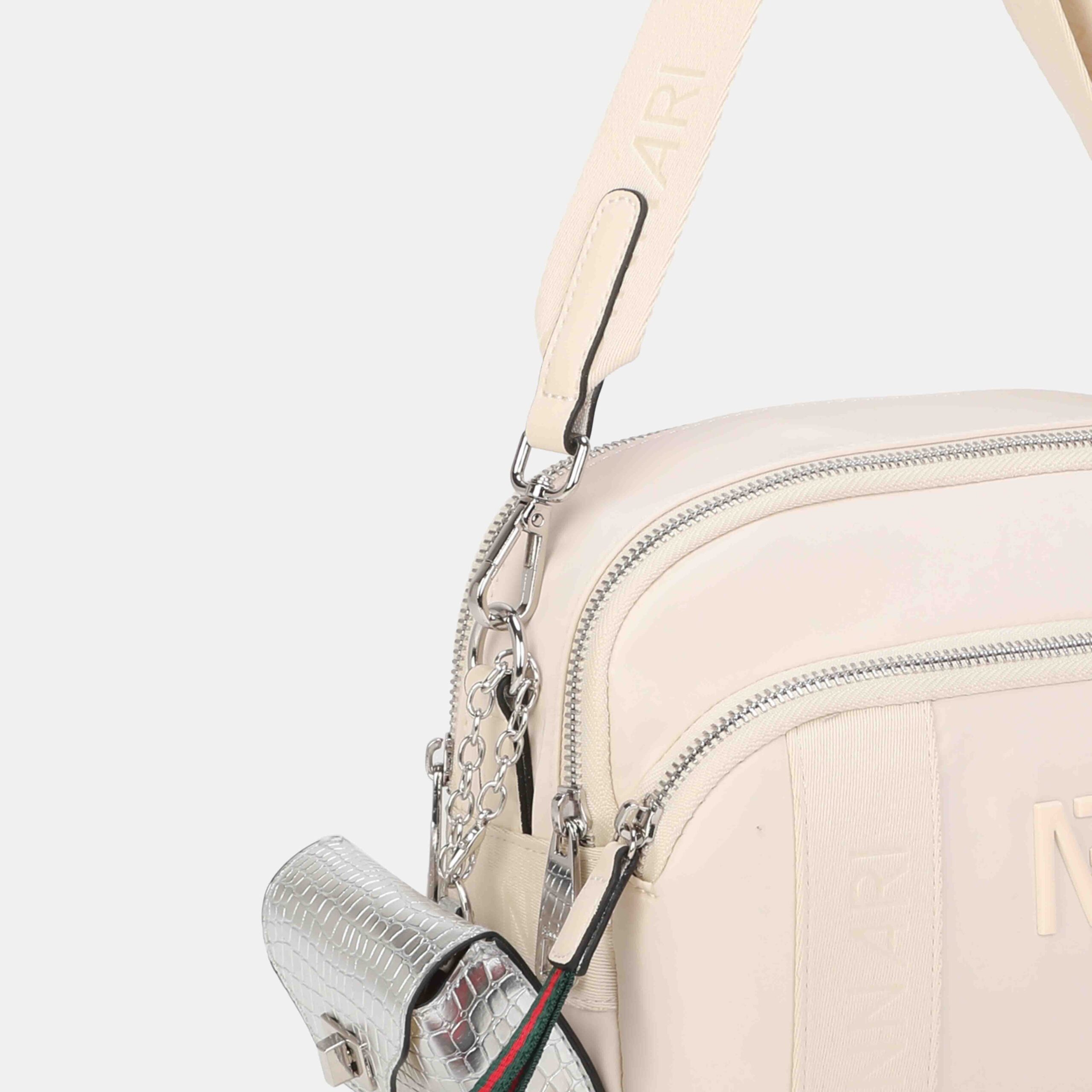 Saco crossbody feito de nylon resistente com detalhes em PU, leve e muito prático para uso diário. Tem uma pequena bolsa removível com acabamento em couro, perfeita para chaves ou cartões. O design incorpora o logótipo NB em tom correspondente e tiras largas ajustáveis com o nome da marca. Além disso, inclui uma pega decorativa que lhe confere um toque moderno e distintivo. Um modelo confortável, funcional e super moderno.